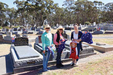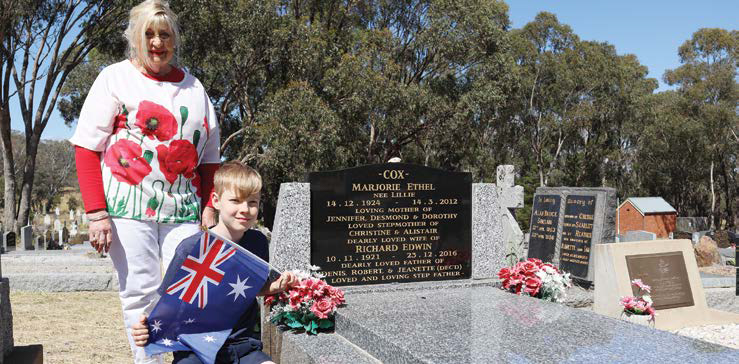 Meanwhile, the Maldon Cemetery Trust (MCT) had spent Sunday 10 November placing Australian Flags on the graves of former service members. MCT committee member Rhiannon Govier spoke about the importance of introducing younger people to the significance of the cemetery, noting that she has five generations of forebears buried there. “It’s very meaningful, this whole cemetery,” she said. Her son Will Govier from Maldon Primary School, with grandmother Jenni McKenzie [above], swept and cleaned the grave and headstone of his great-grandfather before proudly placing a flag. Â