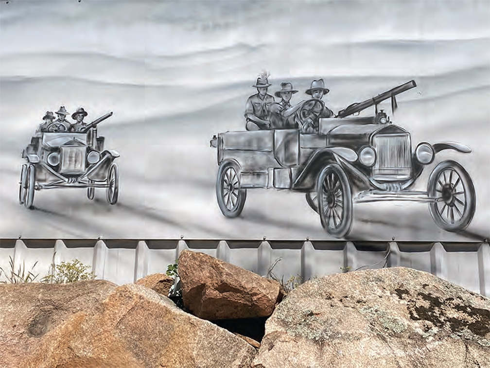 The Light Horse reached its zenith during the First World War in Sinai and Palestine in the scenes depicted along the fence behind the Corryong RSL Hall. Meanwhile artist Simon White reveals the increasing mechanisation of warfare in his portrayal of a car from the 1st Light Car Patrol, the tanks that were used for the first time in Palestine in the Second Battle of Gaza in 1917 and the fledgling 1st Squadron Australian Air Corps planes that were used increasingly throughout the Palestine Campaign.