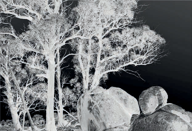 Michelle C took her black and white image “Spotlighting” and reversed the tones to give the effect of a negative, earning an Honour. Judge John Stewart commented “It’s a simple yet effective image with the trees contrasting with, and being balanced by, the boulders on the right. The black sky works very effectively to make the trees and rocks stand out. Well done for trying something different.”