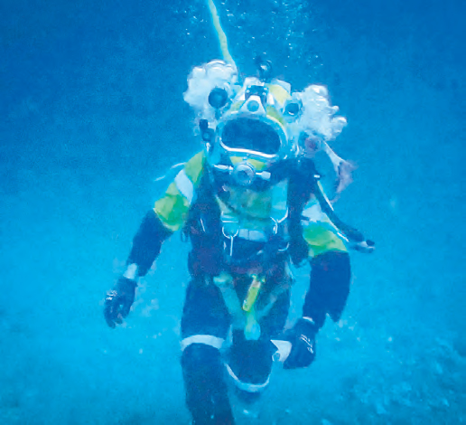 The cord also provides warm water that’s pumped through the dive suit via a network of rubber pipes like veins to avoid hypothermia.