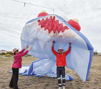 Giant kites. Julie Kollep, of Adelaide, with her bicycle rider kite; a giant flying fish takes flight at Ardrossan; Georgia, of Tanunda, about to launch her kite.