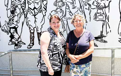 Over fifty people gathered on Friday to celebrate the pop-up launch of the Wiregrass mural at the Kaniva Post Office. The mural depicts townsfolk queuing at the Post Office—a scene that celebrates the spirit of rural life when such places were essential for keeping communities connected. At its heart is a nod to Leason’s mother Mary in her fur stole, and their family dog, Wodger.
