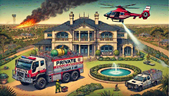 Compounding this is their volunteers are falling away, leaving an overpaid, over-regulated, and risk averse professional fire fighting force ill-prepared to manage the escalating threat of modern wildfires. In their wake, private companies have stepped in, offering faster, more flexible, and better-equipped services—but only to those who can afford them.