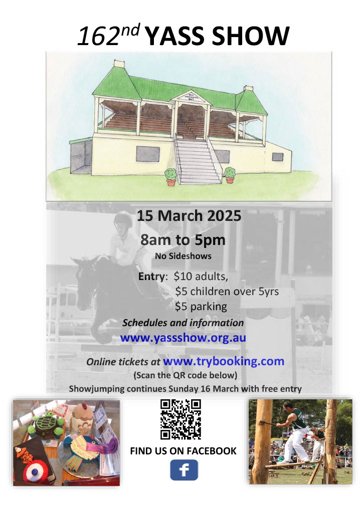 There are all the usual pavilion exhibits – cooking, jams and preserves, needlecraft, fruit, veggies, lego, handicrafts, plants, flowers, decorated wheelbarrows, wool, and honey. Non-perishable entries are due in on Tuesday 11 March between 1 and 6 pm. Perishable items such as plants and flowers, fruit and vegetables and cooking are due in on Friday 14 March. Schedules and entry forms are available on the website: yassshow.org.au.