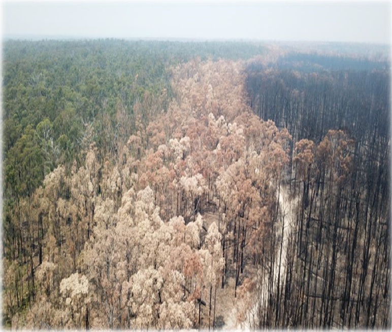 The problem with Bradstock’s and other academics’ analysis is that they ignore what is not widely reported about broadscale prescribed burning – few summers go by without examples of potentially devastating bushfires running into light fuels and being easily controlled. Thus, when a major conflagration occurs on the scale of Black Saturday, Canberra 2003 fires or the 2019-20 fires, where extensive areas were severely burnt, the stories and evidence showing these examples, such as the photo below, are often ignored.