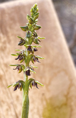 Midge Orchids have a thin leaf from which a bunch of tiny flowers emerges. They are generally yellow to pale green, though a rare variety on southern YP is a deep maroon red.