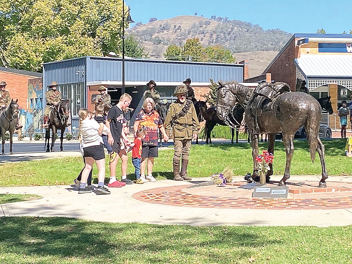 By the time the Memorial Ride rode into Tallangatta, the success of the venture was readily apparent and a crowd was forming around the Sandy sculpture to welcome the riders. The service that followed was a magnificent commemoration of the ride’s aim to highlight the legacy of the Australian Light Horse as a voice from the bush in the spirit of Anzac commemorating all those who have served their country throughout Australia’s service in the Boer War, both world wars, Korea, Vietnam and subsequent conflicts.