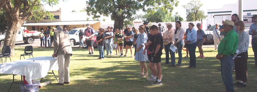 In what is now custom, the Dawn Service began with the War Memorial highlighted by 21 candles, one for each of the Wilcannia men who died during the World War One. When Nicole Seekamp, “Coonoolcra” Station, read out each of their names and ages, a sobering moment, especially for the younger ones – the youngest was Christie Walter Allison Jones, aged 18.