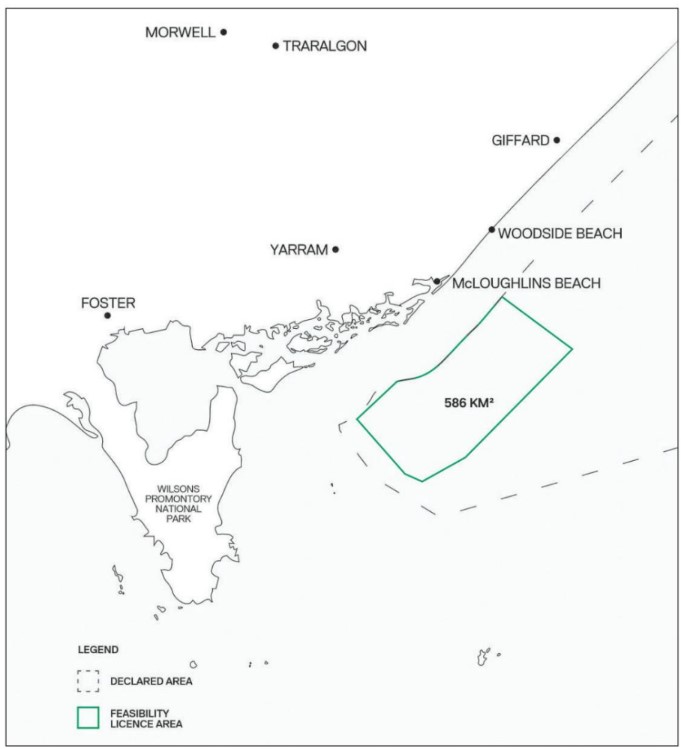 The project is 10 kilometres offshore in a 586 square kilometre zone between Port Albert and Woodside Beach. It would include up to 150 turbines and a transmission system to connect it to the grid.