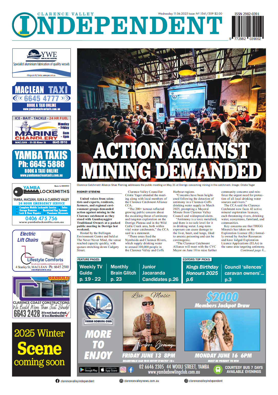 NewsNSWOut now - Archive - June 2025 Clarence Valley Independent, 11 June 2025 By Clarence Valley Independent 12 June 2025 Recent stories Council is running effectively – OLG Rodney Stevens, Clarence Valley Independent - Newstead medical physicist grateful to help community Contributor, Tarrangower Times - Old wool table now looks classy Mim Rogers, Allora Advertiser - New Australia-United Kingdom MOU to unlock more investment: Chalmers, Reeves Contributor, ARR.News - Country Cabinet to continue under re-elected Malinauskas Government: Malinauskas Contributor, ARR.News - Public artwork commission to celebrate Loddon riverbanks Contributor, ARR.News - Don’t risk a bite to the hand that feeds Contributor, ARR.News - Watch My Cousin Frank on SBS On Demand: NORPA Contributor, ARR.News - Welcoming Hurford Hardwood as a NORPA Partner: NORPA Contributor, ARR.News - Killing koalas with kindness: Vic Jurskis Vic Jurskis - Opening smarter pathways to cut landfill emissions and earn ACCU revenue: Wilson Contributor, ARR.News - Light Horse skills not lost Mark Collins, Corryong Courier - Environmental surveys continue Contributor, The Buloke Times - Farmers’ rights eroded Contributor, The Buloke Times - Fuel crisis hits hard Narrandera Argus - Load more Clarence Valley Independenthttps://clarencevalleynews.com.au/ Out now! Buy here! Please leave this field emptyKEEP IN TOUCH Sign up for updates from Australian Rural & Regional News Manage your subscription We don’t spam! Read our privacy policy for more info. Thank you for subscribing for updates from Australian Rural & Regional News! By default you will receive all our newsletters. If you'd prefer to choose which newsletters you receive, go to the manage your subscription page make your selection. I'd love to hear from you if you have any feedback on the newsletter or the news platform or the news itself. Best Wishes, Fiona Fox The Editor Share FacebookLinkedinXPinterestWhatsAppEmailReddIt Previous articleBuybacks to push dairy farmers to the brink: NSW Farmers AssociationNext articleNhill Free Press & Kaniva Times, 11 June 2025 For all the news from the Clarence Valley Independent, go to https://clarencevalleynews.com.au/ Out Now! Tarrangower Times, 17 April 2026 Tarrangower Times - Clarence Valley Independent, 17 April 2026 Clarence Valley Independent - Corryong Courier, 16 April 2026 Mark Collins, Corryong Courier - Narrandera Argus, 16 April 2026 Narrandera Argus - On Our Selection News, 16 April 2026 Ted Rogers, On Our Selection News - The Buloke Times, 16 April 2026 The Buloke Times - Coast Community News, 16 April 2026 Coast Community News - The Koondrook and Barham Bridge Newspaper, 16 April 2026 Lloyd Polkinghorne, The Koondrook and Barham Bridge Newspaper - See all Latest stories from the Clarence Valley Independent on ARR.News Council is running effectively – OLG Rodney Stevens, Clarence Valley Independent - 17 April 2026 International affair at Highland Gathering Rodney Stevens, Clarence Valley Independent - 10 April 2026 121st Maclean Highland Gathering Rodney Stevens, Clarence Valley Independent - 2 April 2026 Unanimous vote shows what matters Emma Pritchard, Clarence Valley Independent - 27 March 2026 Sparkling moment as new Assistant Bishop consecrated Emma Pritchard, Clarence Valley Independent - 20 March 2026 Bluesfest in liquidation, 2026 cancelled Rodney Stevens, Clarence Valley Independent - 20 March 2026 Celebrating our local women Contributor, Clarence Valley Independent - 13 March 2026 Flood that cost over $3.7 billion Rodney Stevens, Clarence Valley Independent - 6 March 2026 Load more