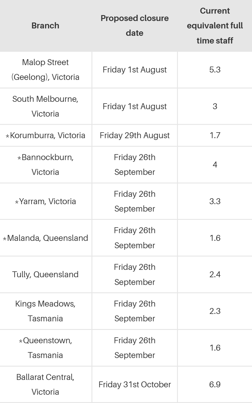 “The largest impact from this decision will be felt in the bank’s home state of Victoria with six branches closing including larger regional branches in Geelong and Ballarat, and a suburban branch in South Melbourne.