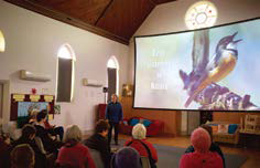 Describing the fascinating physical attributes of birds, their social behaviours and their (often sophisticated) songs or calls, Andrew wove evolution into every point in his presentation. “The birds or creatures have evolved to support the way that they live,” he stated. He demonstrated different songs and phrases, comparing them to a game and said the birds interact to change the song like a Mexican wave. “They’re not just singing, they are listening; a form of acknowledging each other, working out their home ranges,” he said. “They’re singing with a common repertoire, the same sonic identity, becoming a community of birds.”