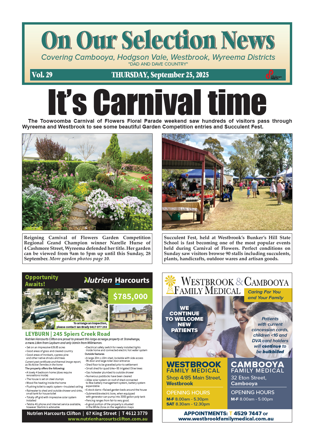 NewsOut now - Archive - September 2025Qld On Our Selection News, 25 September 2025 By Ted Rogers, On Our Selection News 25 September 2025 Recent stories Council is running effectively – OLG Rodney Stevens, Clarence Valley Independent - Newstead medical physicist grateful to help community Contributor, Tarrangower Times - Old wool table now looks classy Mim Rogers, Allora Advertiser - New Australia-United Kingdom MOU to unlock more investment: Chalmers, Reeves Contributor, ARR.News - Country Cabinet to continue under re-elected Malinauskas Government: Malinauskas Contributor, ARR.News - Public artwork commission to celebrate Loddon riverbanks Contributor, ARR.News - Don’t risk a bite to the hand that feeds Contributor, ARR.News - Watch My Cousin Frank on SBS On Demand: NORPA Contributor, ARR.News - Welcoming Hurford Hardwood as a NORPA Partner: NORPA Contributor, ARR.News - Killing koalas with kindness: Vic Jurskis Vic Jurskis - Opening smarter pathways to cut landfill emissions and earn ACCU revenue: Wilson Contributor, ARR.News - Light Horse skills not lost Mark Collins, Corryong Courier - Environmental surveys continue Contributor, The Buloke Times - Farmers’ rights eroded Contributor, The Buloke Times - Fuel crisis hits hard Narrandera Argus - Load more Ted Rogers, On Our Selection Newshttps://www.our-news.com.au/on-our-selection-news Out now! Please leave this field emptyKEEP IN TOUCH Sign up for updates from Australian Rural & Regional News Manage your subscription We don’t spam! Read our privacy policy for more info. Thank you for subscribing for updates from Australian Rural & Regional News! By default you will receive all our newsletters. If you'd prefer to choose which newsletters you receive, go to the manage your subscription page make your selection. I'd love to hear from you if you have any feedback on the newsletter or the news platform or the news itself. Best Wishes, Fiona Fox The Editor Share FacebookLinkedinXPinterestWhatsAppEmailReddIt Previous articleAllora Advertiser, 24 September 2025Next articleTurning a cup of tea into a life changing conversation: BCNA For all the news from On Our Selection News, go to https://www.our-news.com.au/on-our-selection-news Out Now! Tarrangower Times, 17 April 2026 Tarrangower Times - Clarence Valley Independent, 17 April 2026 Clarence Valley Independent - Corryong Courier, 16 April 2026 Mark Collins, Corryong Courier - Narrandera Argus, 16 April 2026 Narrandera Argus - On Our Selection News, 16 April 2026 Ted Rogers, On Our Selection News - The Buloke Times, 16 April 2026 The Buloke Times - Coast Community News, 16 April 2026 Coast Community News - The Koondrook and Barham Bridge Newspaper, 16 April 2026 Lloyd Polkinghorne, The Koondrook and Barham Bridge Newspaper - See all Latest stories from On Our Selection News on ARR.News Ramsay local to captain Queensland Polocrosse team Ted Rogers, On Our Selection News - 16 April 2026 Westbrook man charged after car-jacking spree Ted Rogers, On Our Selection News - 9 April 2026 Darling Downs 2026 Showgirl chosen Ted Rogers, On Our Selection News - 2 April 2026 Agforce leader talks on food security Ted Rogers, On Our Selection News - 26 March 2026 Baby baboons at the Darling Downs Zoo! Ted Rogers, On Our Selection News - 19 March 2026 Adult time, adult crime laws expanded Ted Rogers, On Our Selection News - 12 March 2026 Infrastructure cost kills plan for new shop at Wyreema Ted Rogers, On Our Selection News - 5 March 2026 Join the Southbrook endurance ride Ted Rogers, On Our Selection News - 26 February 2026 Load more