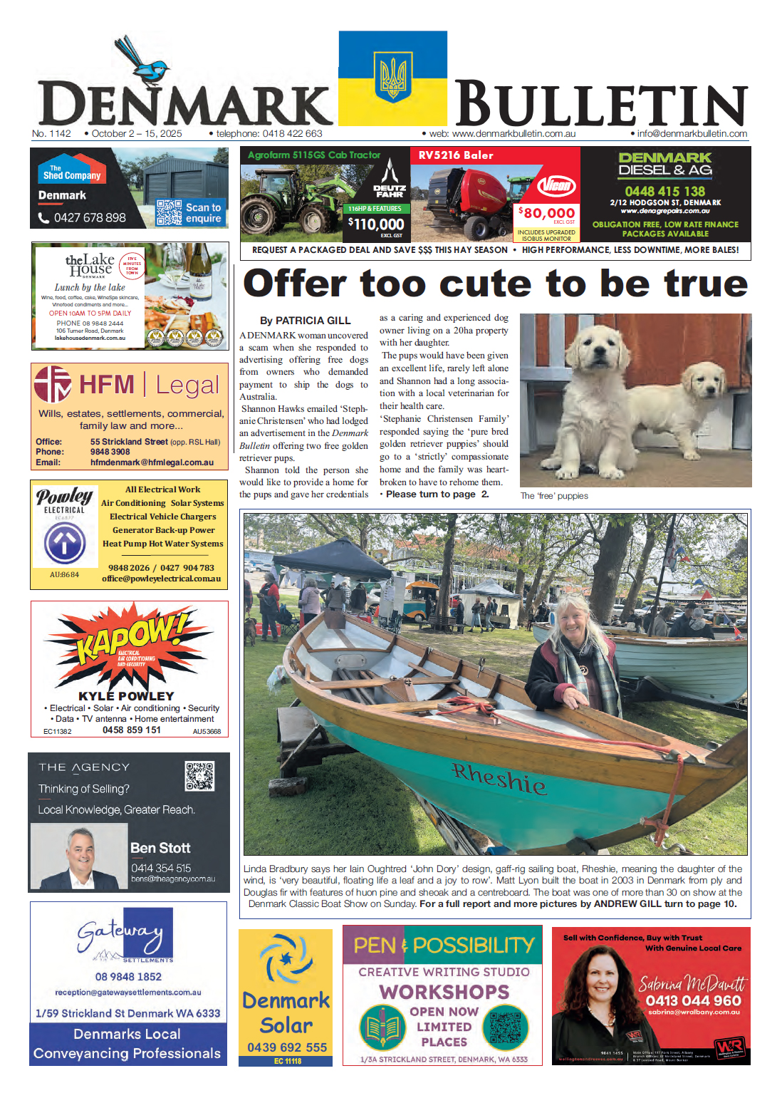 NewsOut nowWA Denmark Bulletin, 2 October 2025 By Denmark Bulletin 2 October 2025 Recent stories Food & Fibre Great South Coast to host Future Farming Forum across Warrnambool, Portland, and Hamilton Contributor, ARR.News - Visiting caravans bringing thousands to local community Murray Pioneer - Postcode exclusion is killing hospitality in Hay Tertia Butcher, The Riverine Grazier - 20 new space missions to touch down in SA: Malinauskas, Szakacs Contributor, ARR.News - When the “Battle of Britain” came to Nhill Emily Gladdis, Nhill Free Press & Kaniva Times - $250,000 health plan endorsed Chris Oldfield, Naracoorte Community News - “Inappropriate and insensitive” Rodney Stevens, Clarence Valley Independent - Local women go to Sydney for the NSWRL Gala Day Wilcannia News - 125th Annual Berrigan Show, 5 October 2025 Contributor, ARR.News - Crime wave worsening under Labor as regional communities left exposed: Cleeland Contributor, ARR.News - NSW country mayors raise concerns about centralised planning for rural NSW: CMA Contributor, ARR.News - Crowds flock to YP Field Days Yorke Peninsula Country Times - Creative Streets takes flight with aerial acts Contributor, ARR.News - Major road safety boost – Transforming hundreds of kilometres of regional roads and extending their life by decades: Aitchison Contributor, ARR.News - Mobile phone coverage must be included in Universal Service Obligation reform: Littleproud, Webster Contributor, ARR.News - Load more Denmark Bulletinhttp://www.denmarkbulletin.com.au/ Out now! Available here! Please leave this field emptyKEEP IN TOUCH Sign up for updates from Australian Rural & Regional News Manage your subscription We don’t spam! Read our privacy policy for more info. Thank you for subscribing for updates from Australian Rural & Regional News! By default you will receive all our newsletters. If you'd prefer to choose which newsletters you receive, go to the manage your subscription page make your selection. I'd love to hear from you if you have any feedback on the newsletter or the news platform or the news itself. Best Wishes, Fiona Fox The Editor Share FacebookLinkedinTwitterPinterestWhatsAppEmailReddIt Previous articleFood & Fibre Great South Coast to host Future Farming Forum across Warrnambool, Portland, and HamiltonNext articleNarrandera Argus, 2 October 2025 For all the news from the Denmark Bulletin, go to http://www.denmarkbulletin.com.au/ Out Now! The Koondrook and Barham Bridge Newspaper, 2 October 2025 Lloyd Polkinghorne, The Koondrook and Barham Bridge Newspaper - Narrandera Argus, 2 October 2025 Narrandera Argus - Murray Pioneer, 1 October 2025 Murray Pioneer - The Riverine Grazier, 1 October 2025 Krista Schade, The Riverine Grazier - Kyogle News INKY, 1 October 2025 Susanna Freymark, indyNR.com - Nhill Free Press & Kaniva Times, 1 October 2025 Emily Gladdis, Nhill Free Press & Kaniva Times - The Naracoorte News, 1 October 2025 Michael Waite, Naracoorte Community News - Clarence Valley Independent, 1 October 2025 Clarence Valley Independent - See all Latest stories from the Denmark Bulletin on ARR.News Call for more care with burns Denmark Bulletin - 18 September 2025 Denmark back in the big time Denmark Bulletin - 4 September 2025 Summer toil brings winter treat for Denmark music lovers Denmark Bulletin - 21 August 2025 Look what’s popped up! Denmark Bulletin - 21 August 2025 Local research homing in on the year round truffle Denmark Bulletin - 21 August 2025 Sue a bronze Aussie at 69 Denmark Bulletin - 7 August 2025 Eyes down and looking as volunteers get seeds sorted Denmark Bulletin - 7 August 2025 Inlet conditions right on the mark for opening Denmark Bulletin - 7 August 2025 Load more