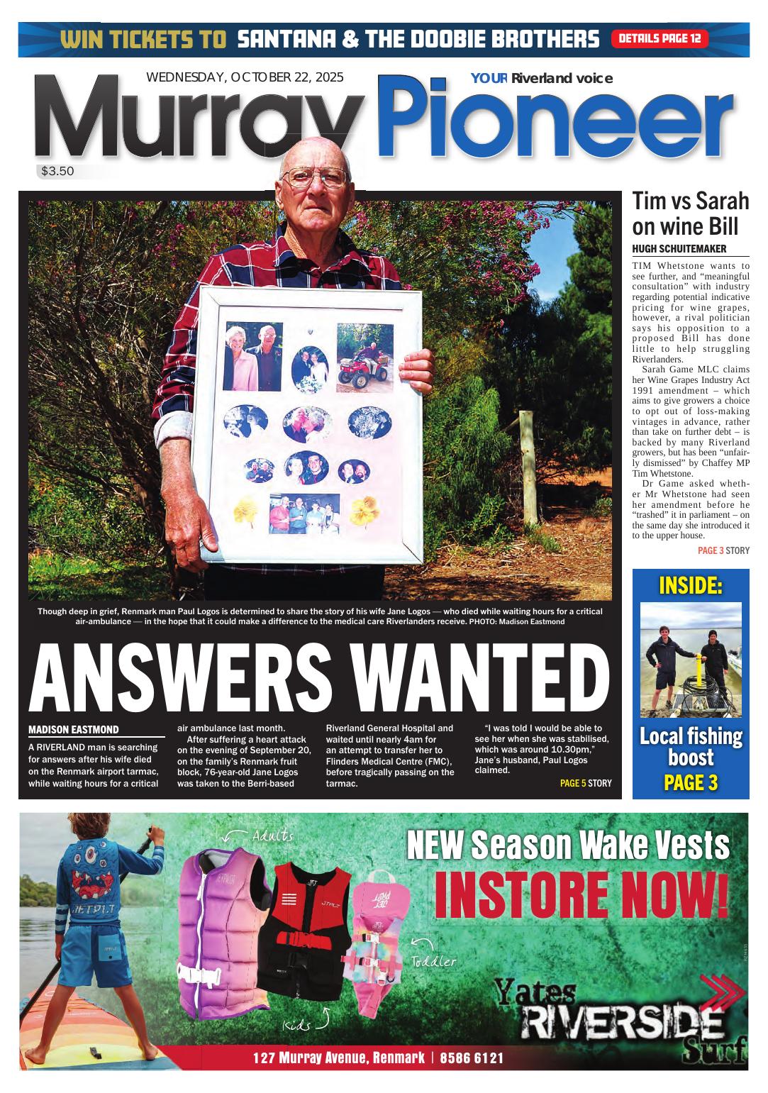 After suffering a heart attack on the evening of September 20, on the family’s Renmark fruit block, 76-year-old Jane Logos was taken to the Berri-based Riverland General Hospital and waited until nearly 4am for an attempt to transfer her to Flinders Medical Centre (FMC), before tragically passing on the tarmac.