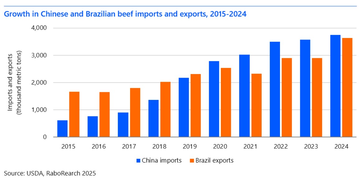 “Brazilian beef exports have surged from 2.3 million metric tons in 2019 to an estimated 3.6 million metric tons in 2024, largely fuelled by China’s growing market demand.”
