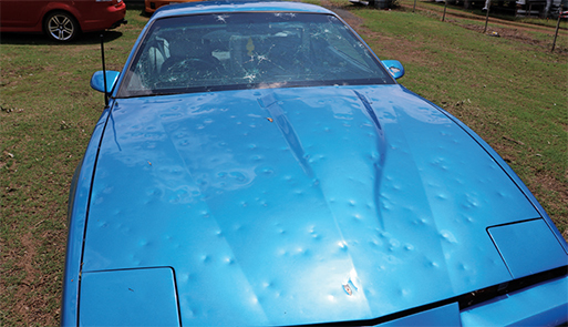 Many windows and skylights smashed, solar panels were severely impacted, pvc gutterings and downpipes were extensively damaged while front and back windscreens on vehicles were broken and large hail dents were inflicted on most of the panels on the impacted vehicles.
