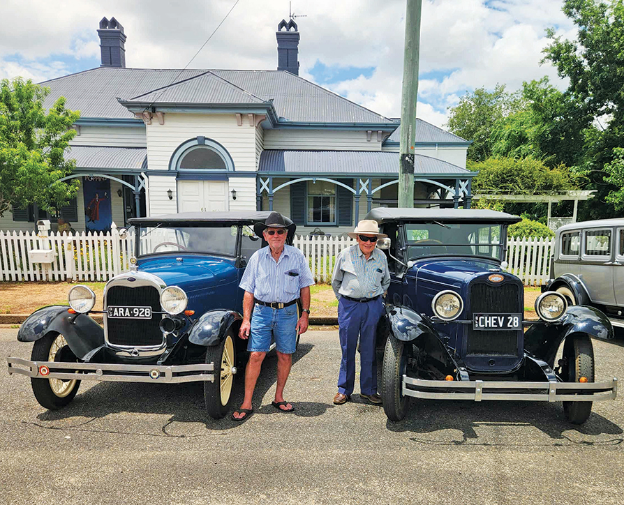 Mary Poppins House – the perfect backdrop for Lester Diggles with his Model A Ford 1928 on the left and Alwin Chalk with his 1928 Chevrolet on the right. (People may remember Alwin when he was a young boy delivering the Allora Advertiser around town.)