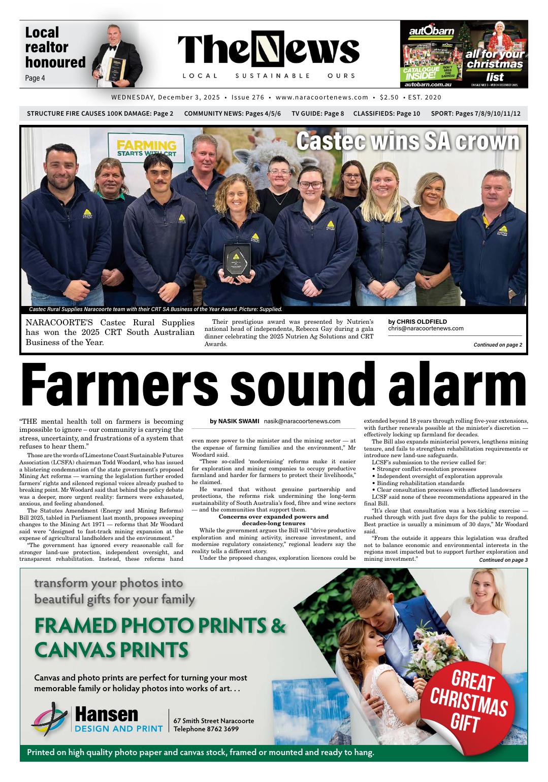 The Statutes Amendment (Energy and Mining Reforms) Bill 2025, tabled in Parliament last month, proposes sweeping changes to the Mining Act 1971 — reforms that Mr Woodard said were “designed to fast-track mining expansion at the expense of agricultural landholders and the environment.”