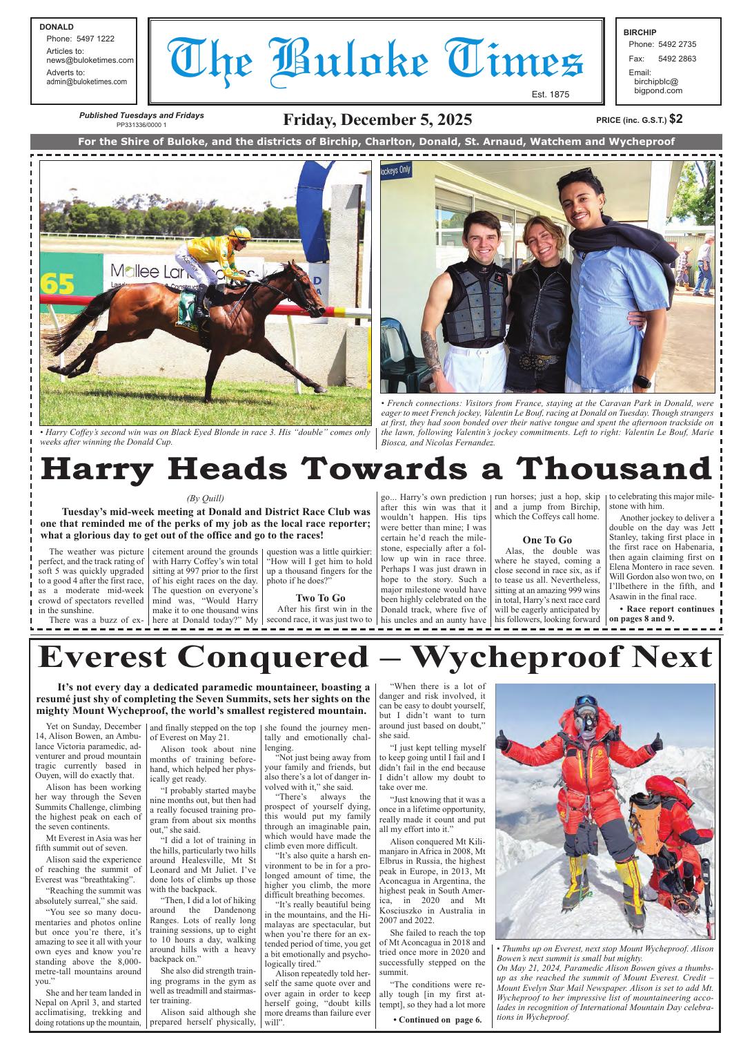 The Donald and District Racing Club will take a break now for the holiday season and to wait out the severity of summer before racing returns next year, on May 2, for the running of the Weir’s IGA Classic. In the meantime, pay attention to Harry Coffey’s race card at Ballarat tomorow (Saturday), where his thousand-win milestone is likely to be marked.
