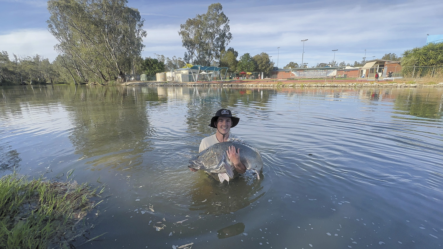 A young angler has landed the catch of a lifetime off the Cohuna pier, reeling in a metre-plus Murray cod that has kids around town asking him how to fish.