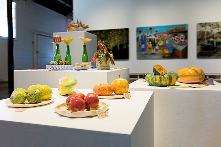 Her collection of ceramics includes flowers, pottery, fruit, vegetables, and even the sashes and prize cards associated with agricultural show displays.
