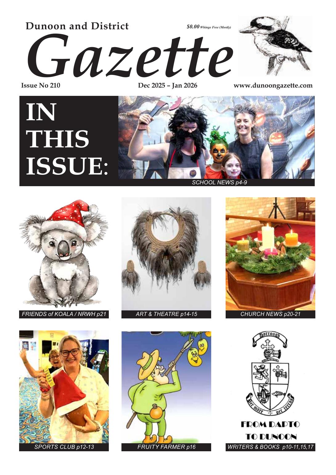 NewsNSWOut now - Archive - December 2025 Dunoon and District Gazette, December 2025-January 2026 By Dunoon and District Gazette 22 December 2025 Recent stories Fertiliser shortage at home, subsidies for exports abroad Trevor Whittington, CEO WAFarmers - Council is running effectively – OLG Rodney Stevens, Clarence Valley Independent - Newstead medical physicist grateful to help community Contributor, Tarrangower Times - Old wool table now looks classy Mim Rogers, Allora Advertiser - New Australia-United Kingdom MOU to unlock more investment: Chalmers, Reeves Contributor, ARR.News - Country Cabinet to continue under re-elected Malinauskas Government: Malinauskas Contributor, ARR.News - Public artwork commission to celebrate Loddon riverbanks Contributor, ARR.News - Don’t risk a bite to the hand that feeds Contributor, ARR.News - Watch My Cousin Frank on SBS On Demand: NORPA Contributor, ARR.News - Welcoming Hurford Hardwood as a NORPA Partner: NORPA Contributor, ARR.News - Killing koalas with kindness: Vic Jurskis Vic Jurskis - Opening smarter pathways to cut landfill emissions and earn ACCU revenue: Wilson Contributor, ARR.News - Light Horse skills not lost Mark Collins, Corryong Courier - Environmental surveys continue Contributor, The Buloke Times - Farmers’ rights eroded Contributor, The Buloke Times - Load more Dunoon and District Gazettehttp://dunoongazette.com/ Out now! Available here! Please leave this field emptyKEEP IN TOUCH Sign up for updates from Australian Rural & Regional News Manage your subscription We don’t spam! Read our privacy policy for more info. Thank you for subscribing for updates from Australian Rural & Regional News! By default you will receive all our newsletters. If you'd prefer to choose which newsletters you receive, go to the manage your subscription page make your selection. I'd love to hear from you if you have any feedback on the newsletter or the news platform or the news itself. Best Wishes, Fiona Fox The Editor Share FacebookLinkedinXPinterestWhatsAppEmailReddIt Previous articleMural completed at Darlington Point pool just in time for ChristmasNext articleThe Roaring 1920s to the Turbulent 2020s For all the news from the Dunoon and District Gazette, go to http://dunoongazette.com/ Out Now! Tarrangower Times, 17 April 2026 Tarrangower Times - Clarence Valley Independent, 17 April 2026 Clarence Valley Independent - Corryong Courier, 16 April 2026 Mark Collins, Corryong Courier - Narrandera Argus, 16 April 2026 Narrandera Argus - On Our Selection News, 16 April 2026 Ted Rogers, On Our Selection News - The Buloke Times, 16 April 2026 The Buloke Times - Coast Community News, 16 April 2026 Coast Community News - The Koondrook and Barham Bridge Newspaper, 16 April 2026 Lloyd Polkinghorne, The Koondrook and Barham Bridge Newspaper - See all Latest stories from the Dunoon and District Gazette on ARR.News Australia Day awards – Mike Berry Dunoon and District Gazette - 20 February 2026 A medicated spa day for one lucky echidna Dunoon and District Gazette - 22 December 2025 Workforce crisis in NSW Dunoon and District Gazette - 16 October 2025 Macadamia nuts: The diva of the orchard Dunoon and District Gazette - 18 August 2025 From Dapto to Dunoon – the Dorrough family story Dunoon and District Gazette - 18 August 2025 Introducing the Female of the Species cast Dunoon and District Gazette - 18 August 2025 Richmond Landcare – Science in the Pub Dunoon and District Gazette - 16 June 2025 Men’s shed news with Ross McDougall Dunoon and District Gazette - 16 June 2025 Load more