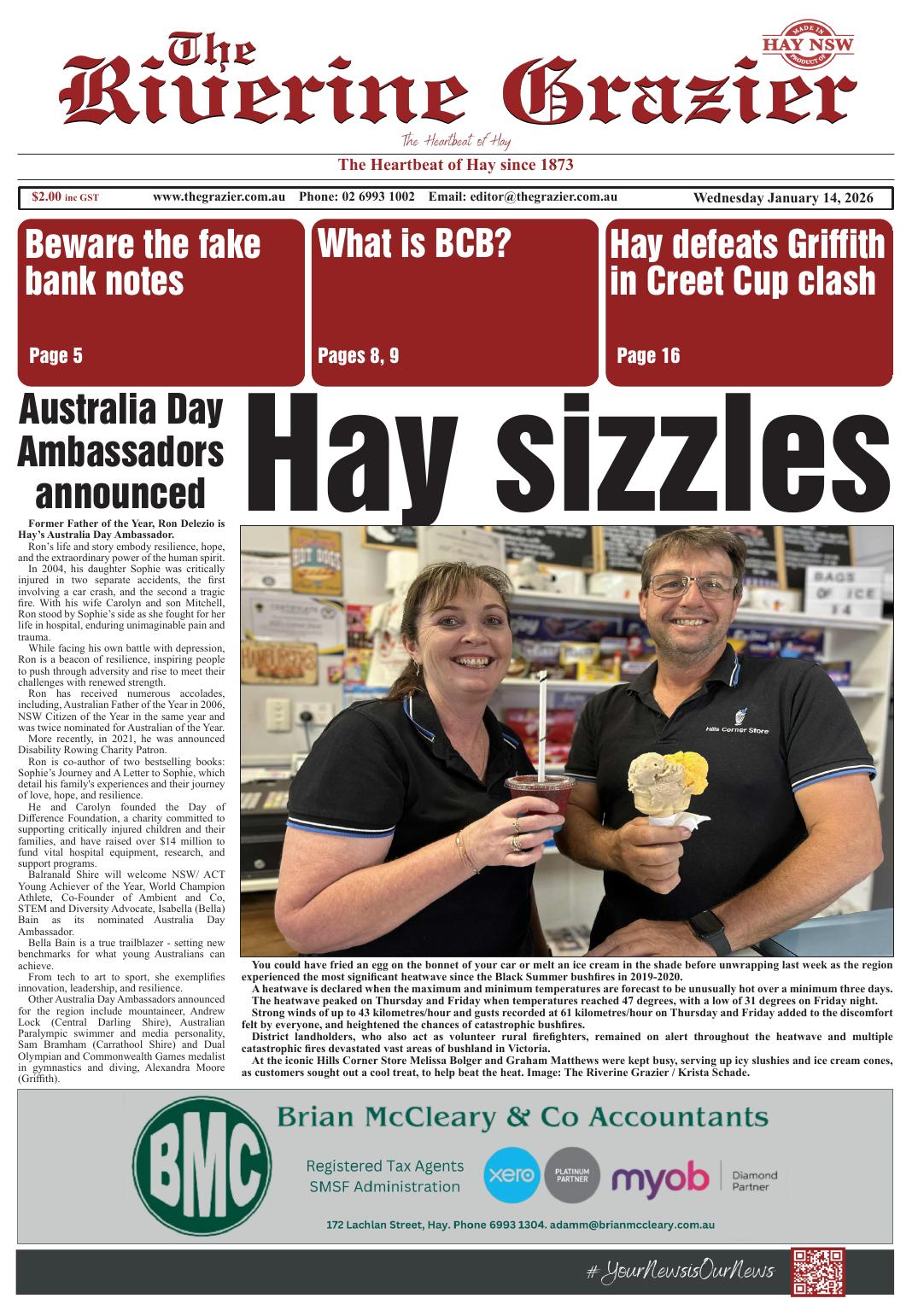 NewsNSWOut now - Archive - January 2026 The Riverine Grazier, 14 January 2026 By Krista Schade, The Riverine Grazier 14 January 2026 Recent stories Radical Right v Radical Left and the threat of the Age of Unreason Kookaburra, ARR.News - Renewed effort to supercharge faba bean breeding and expansion: GRDC Contributor, ARR.News - Elders bales on WA wool growers – Just the tip of the iceberg: Geoff Pearson WAFarmers Contributor, ARR.News - SA standing up for the River Murray – does One Nation?: Bourke Contributor, ARR.News - New Regional University Study Hub opens in Tumut: Clare, McBain Contributor, ARR.News - Council continues targeted engagement ahead of Murray-Darling Basin Plan review Contributor, ARR.News - Low – interest drought loans open with a warning for growers Murray Pioneer - Naracoorte’s rising star Nasik Swami, Naracoorte Community News - Grandstand opening Emily Gladdis, Nhill Free Press & Kaniva Times - Dinawan Solar Farm approved despite strong objections Tertia Butcher, The Riverine Grazier - RACGP leaders head to regional Victoria Contributor, ARR.News - New machine improves soil fertility and increases crop yields Greg Hamilton, ARR.News Sponsor - Diesel stockpile for WA – announcement and response Contributor, ARR.News - Algal bloom on the move Yorke Peninsula Country Times - Italian for a day or for 145 years at New Italy celebrations Contributor, indyNR.com - Load more Krista Schade, The Riverine Grazierhttps://www.thegrazier.com.au Out now! Subscribe here! Please leave this field emptyKEEP IN TOUCH Sign up for updates from Australian Rural & Regional News Manage your subscription We don’t spam! Read our privacy policy for more info. Thank you for subscribing for updates from Australian Rural & Regional News! By default you will receive all our newsletters. If you'd prefer to choose which newsletters you receive, go to the manage your subscription page make your selection. I'd love to hear from you if you have any feedback on the newsletter or the news platform or the news itself. Best Wishes, Fiona Fox The Editor Share FacebookLinkedinXPinterestWhatsAppEmailReddIt Previous articleNhill Free Press & Kaniva Times, 14 January 2026Next articleA matter of trust: unpacking Bendigo’s Better Big Bank campaign For all the news from The Riverine Grazier, go to https://www.thegrazier.com.au Out Now! Narrandera Argus, 16 April 2026 Narrandera Argus - On Our Selection News, 16 April 2026 Ted Rogers, On Our Selection News - The Buloke Times, 16 April 2026 The Buloke Times - Coast Community News, 16 April 2026 Coast Community News - The Koondrook and Barham Bridge Newspaper, 16 April 2026 Lloyd Polkinghorne, The Koondrook and Barham Bridge Newspaper - Allora Advertiser, 15 April 2026 Mim Rogers, Allora Advertiser - Murray Pioneer, 15 April 2026 Murray Pioneer - Kyogle News INKY, 15 April 2026 Susanna Freymark, indyNR.com - See all Latest stories from The Riverine Grazier on ARR.News Dinawan Solar Farm approved despite strong objections Tertia Butcher, The Riverine Grazier - 15 April 2026 ‘A piece of paper in the wind’ – Part One of shining a light on Hay’s homelessness issue Kimberly Grabham, The Riverine Grazier - 8 April 2026 Council prepares to launch 10-year plan, reflecting economic transition Tertia Butcher, The Riverine Grazier - 1 April 2026 I am not a Harvard graduate – One Nation candidate David Farley Kimberly Grabham, The Riverine Grazier - 25 March 2026 Building an empire, one agri opportunity at a time Tertia Butcher, The Riverine Grazier - 18 March 2026 Tiny homes project changing lives of young students Kimberly Grabham, The Riverine Grazier - 11 March 2026 The stink about releasing the carp virus Krista Schade, The Riverine Grazier - 4 March 2026 EnergyCo needs a shake-up Tertia Butcher, The Riverine Grazier - 25 February 2026 Load more