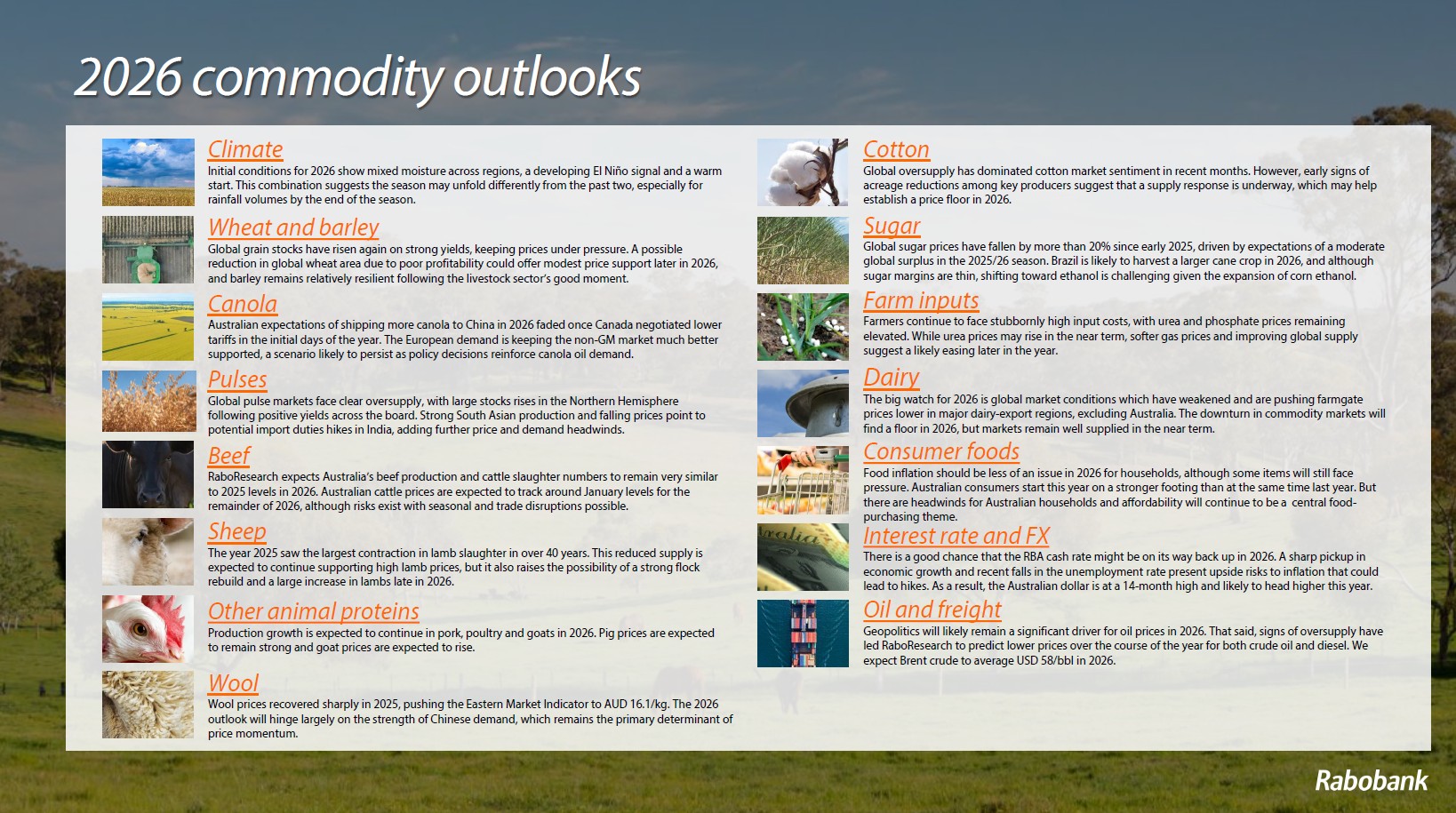 The report says agri commodity prices are forecast to remain “divided” in 2026, with prices for grains, oilseeds, pulses, cotton and sugar set to stay subdued, while meat, wool and dairy are expected to perform relatively well (albeit dairy prices are coming under increasing pressure from strong global supply).