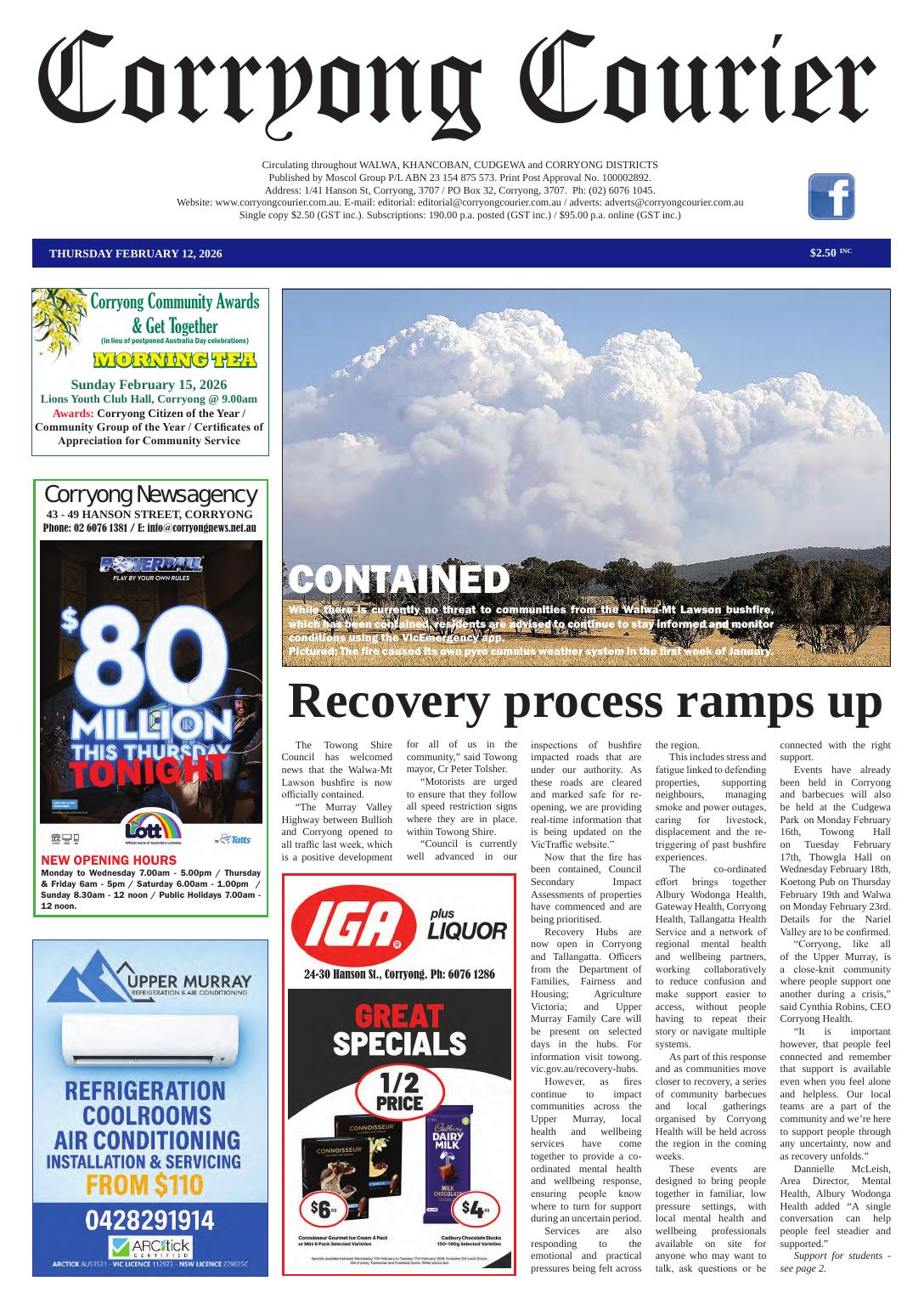 NewsOut now - Archive - February 2026Vic Corryong Courier, 12 February 2026 By Mark Collins, Corryong Courier 12 February 2026 Recent stories Right royal award for a guinea pig lover Coast Community News - Labor Government must act on wine crisis to help fuel crisis: Canavan, Chester Contributor, ARR.News - Renewables lift supply share as batteries re-shape energy markets: AEMO Contributor, ARR.News - Westbrook ANZAC service still growing Ted Rogers, On Our Selection News - Strong turnout for ANZAC Day Coast Community News - Reflection and remembrance on the Mount The Buloke Times - Cadets honoured with memorial role Mark Collins, Corryong Courier - Our fallen will never be forgotten Mark Collins, Corryong Courier - River Country Art Trail unveiled Contributor, The Koondrook and Barham Bridge Newspaper - Faster environmental approvals with states and territories: Albanese, Watt Contributor, ARR.News - Rabobank commentary: food price inflation remains entrenched above three per cent Contributor, ARR.News - Students gain insight into engineering careers Narrandera Argus - Epic Fury and Ukrainian farmers: Who will win? Pavel Kuliuk, ARR.News - Farmland prices set for continued “modest” growth in year ahead – Rabobank Contributor, ARR.News - Agricultural industry bodies seek amendments to proposed legislative reform to maintain protections for Condamine Alluvium groundwater system critical for farmers and rural communities: QFF Contributor, ARR.News - Load more Mark Collins, Corryong Courierhttps://www.corryongcourier.com.au/ Out now! Subscribe here! Please leave this field emptyKEEP IN TOUCH Sign up for updates from Australian Rural & Regional News Manage your subscription We don’t spam! Read our privacy policy for more info. Thank you for subscribing for updates from Australian Rural & Regional News! By default you will receive all our newsletters. If you'd prefer to choose which newsletters you receive, go to the manage your subscription page make your selection. I'd love to hear from you if you have any feedback on the newsletter or the news platform or the news itself. Best Wishes, Fiona Fox The Editor Share FacebookLinkedinXPinterestWhatsAppEmailReddIt Previous articleThe Koondrook and Barham Bridge Newspaper, 12 February 2026Next articleNarrandera Argus, 12 February 2026 For all the news from the Corryong Courier, go to https://www.corryongcourier.com.au/ Out Now! The Buloke Times, 30 April 2026 The Buloke Times - On Our Selection News, 30 April 2026 Ted Rogers, On Our Selection News - Narrandera Argus, 30 April 2026 Narrandera Argus - Corryong Courier, 30 April 2026 Mark Collins, Corryong Courier - Coast Community News, 30 April 2026 Coast Community News - The Koondrook and Barham Bridge Newspaper, 30 April 2026 Lloyd Polkinghorne, The Koondrook and Barham Bridge Newspaper - Allora Advertiser, 29 April 2026 Mim Rogers, Allora Advertiser - Yorke Peninsula Country Times, 28 April 2026 Yorke Peninsula Country Times - See all Latest stories from the Corryong Courier on ARR.News Cadets honoured with memorial role Mark Collins, Corryong Courier - 30 April 2026 Our fallen will never be forgotten Mark Collins, Corryong Courier - 30 April 2026 Gun makes it ten titles Mark Collins, Corryong Courier - 23 April 2026 Light Horse skills not lost Mark Collins, Corryong Courier - 16 April 2026 New trail tracks our heritage through verse Mark Collins, Corryong Courier - 9 April 2026 Councils feel the crunch Mark Collins, Corryong Courier - 9 April 2026 Freeman’s rat hole Mark Collins, Corryong Courier - 2 April 2026 Climate change gums up the works Mark Collins, Corryong Courier - 26 March 2026 Load more