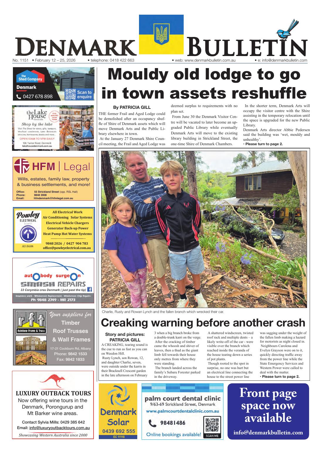 NewsOut now - Archive - February 2026WA Denmark Bulletin, 12 February 2026 By Denmark Bulletin 12 February 2026 Recent stories Right royal award for a guinea pig lover Coast Community News - Labor Government must act on wine crisis to help fuel crisis: Canavan, Chester Contributor, ARR.News - Renewables lift supply share as batteries re-shape energy markets: AEMO Contributor, ARR.News - Westbrook ANZAC service still growing Ted Rogers, On Our Selection News - Strong turnout for ANZAC Day Coast Community News - Reflection and remembrance on the Mount The Buloke Times - Cadets honoured with memorial role Mark Collins, Corryong Courier - Our fallen will never be forgotten Mark Collins, Corryong Courier - River Country Art Trail unveiled Contributor, The Koondrook and Barham Bridge Newspaper - Faster environmental approvals with states and territories: Albanese, Watt Contributor, ARR.News - Rabobank commentary: food price inflation remains entrenched above three per cent Contributor, ARR.News - Students gain insight into engineering careers Narrandera Argus - Epic Fury and Ukrainian farmers: Who will win? Pavel Kuliuk, ARR.News - Farmland prices set for continued “modest” growth in year ahead – Rabobank Contributor, ARR.News - Agricultural industry bodies seek amendments to proposed legislative reform to maintain protections for Condamine Alluvium groundwater system critical for farmers and rural communities: QFF Contributor, ARR.News - Load more Denmark Bulletinhttp://www.denmarkbulletin.com.au/ Out now! Available here! Please leave this field emptyKEEP IN TOUCH Sign up for updates from Australian Rural & Regional News Manage your subscription We don’t spam! Read our privacy policy for more info. Thank you for subscribing for updates from Australian Rural & Regional News! By default you will receive all our newsletters. If you'd prefer to choose which newsletters you receive, go to the manage your subscription page make your selection. I'd love to hear from you if you have any feedback on the newsletter or the news platform or the news itself. Best Wishes, Fiona Fox The Editor Share FacebookLinkedinXPinterestWhatsAppEmailReddIt Previous articleNarrandera Argus, 12 February 2026Next articleThe Buloke Times, 12 February 2026 For all the news from the Denmark Bulletin, go to http://www.denmarkbulletin.com.au/ Out Now! The Buloke Times, 30 April 2026 The Buloke Times - On Our Selection News, 30 April 2026 Ted Rogers, On Our Selection News - Narrandera Argus, 30 April 2026 Narrandera Argus - Corryong Courier, 30 April 2026 Mark Collins, Corryong Courier - Coast Community News, 30 April 2026 Coast Community News - The Koondrook and Barham Bridge Newspaper, 30 April 2026 Lloyd Polkinghorne, The Koondrook and Barham Bridge Newspaper - Allora Advertiser, 29 April 2026 Mim Rogers, Allora Advertiser - Yorke Peninsula Country Times, 28 April 2026 Yorke Peninsula Country Times - See all Latest stories from the Denmark Bulletin on ARR.News Family to donate ‘treasure’ beach find to museum Denmark Bulletin - 23 April 2026 Henri to take on the world after nationals sailing victory Denmark Bulletin - 23 April 2026 Custodial ownership sees Denmark’s jewel sparkle Denmark Bulletin - 9 April 2026 Classic recipe for a long life Denmark Bulletin - 26 March 2026 Wendy’s dream world on show at gallery Denmark Bulletin - 12 March 2026 Nurse’s mercy mission Denmark Bulletin - 26 February 2026 West Coast fishing ban causes south coast congestion Denmark Bulletin - 12 February 2026 Polish home now in Denmark Denmark Bulletin - 29 January 2026 Load more