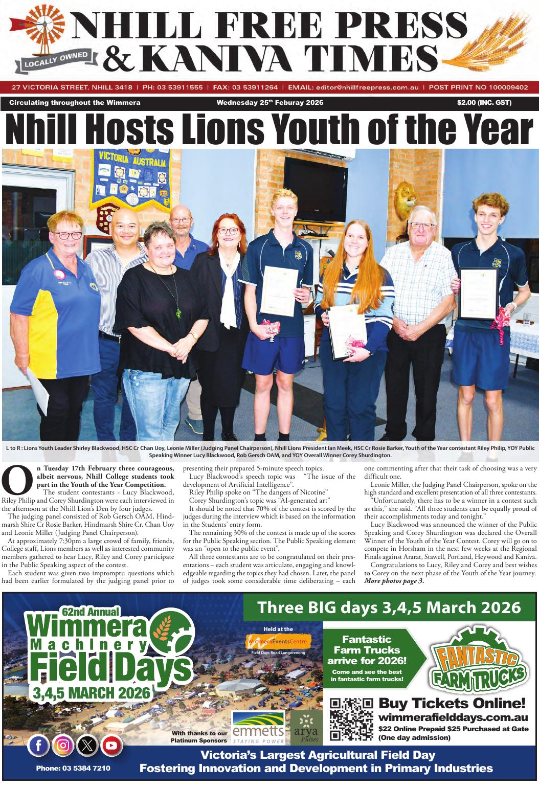 NewsOut now - Archive - February 2026Vic Nhill Free Press & Kaniva Times, 25 February 2026 By Emily Gladdis, Nhill Free Press & Kaniva Times 25 February 2026 Recent stories Right royal award for a guinea pig lover Coast Community News - Labor Government must act on wine crisis to help fuel crisis: Canavan, Chester Contributor, ARR.News - Renewables lift supply share as batteries re-shape energy markets: AEMO Contributor, ARR.News - Westbrook ANZAC service still growing Ted Rogers, On Our Selection News - Strong turnout for ANZAC Day Coast Community News - Reflection and remembrance on the Mount The Buloke Times - Cadets honoured with memorial role Mark Collins, Corryong Courier - Our fallen will never be forgotten Mark Collins, Corryong Courier - River Country Art Trail unveiled Contributor, The Koondrook and Barham Bridge Newspaper - Faster environmental approvals with states and territories: Albanese, Watt Contributor, ARR.News - Rabobank commentary: food price inflation remains entrenched above three per cent Contributor, ARR.News - Students gain insight into engineering careers Narrandera Argus - Epic Fury and Ukrainian farmers: Who will win? Pavel Kuliuk, ARR.News - Farmland prices set for continued “modest” growth in year ahead – Rabobank Contributor, ARR.News - Agricultural industry bodies seek amendments to proposed legislative reform to maintain protections for Condamine Alluvium groundwater system critical for farmers and rural communities: QFF Contributor, ARR.News - Load more Emily Gladdis, Nhill Free Press & Kaniva Timeshttps://www.nhillfreepress.com.au Out now! Subscribe here! Please leave this field emptyKEEP IN TOUCH Sign up for updates from Australian Rural & Regional News Manage your subscription We don’t spam! Read our privacy policy for more info. Thank you for subscribing for updates from Australian Rural & Regional News! By default you will receive all our newsletters. If you'd prefer to choose which newsletters you receive, go to the manage your subscription page make your selection. I'd love to hear from you if you have any feedback on the newsletter or the news platform or the news itself. Best Wishes, Fiona Fox The Editor Share FacebookLinkedinXPinterestWhatsAppEmailReddIt Previous articleThe Riverine Grazier, 25 February 2026Next articleRichmond Valley News INKY, 25 February 2026 For all the news from Nhill Free Press & Kaniva Times, go to https://www.nhillfreepress.com.au Out Now! The Buloke Times, 30 April 2026 The Buloke Times - On Our Selection News, 30 April 2026 Ted Rogers, On Our Selection News - Narrandera Argus, 30 April 2026 Narrandera Argus - Corryong Courier, 30 April 2026 Mark Collins, Corryong Courier - Coast Community News, 30 April 2026 Coast Community News - The Koondrook and Barham Bridge Newspaper, 30 April 2026 Lloyd Polkinghorne, The Koondrook and Barham Bridge Newspaper - Allora Advertiser, 29 April 2026 Mim Rogers, Allora Advertiser - Yorke Peninsula Country Times, 28 April 2026 Yorke Peninsula Country Times - See all Latest stories from Nhill Free Press & Kaniva Times on ARR.News ANZAC Day 2026 Emily Gladdis, Nhill Free Press & Kaniva Times - 29 April 2026 Getting Ready for ANZAC Day 2026 Emily Gladdis, Nhill Free Press & Kaniva Times - 23 April 2026 Grandstand opening Emily Gladdis, Nhill Free Press & Kaniva Times - 15 April 2026 Ava’s fight highlights value of Good Friday Appeal Emily Gladdis, Nhill Free Press & Kaniva Times - 8 April 2026 Harmony Day Emily Gladdis, Nhill Free Press & Kaniva Times - 1 April 2026 From lockdown hobby to gallery walls Emily Gladdis, Nhill Free Press & Kaniva Times - 25 March 2026 Warriors clinch title Emily Gladdis, Nhill Free Press & Kaniva Times - 18 March 2026 Gallery Central featured artist: Peter’s pottery Emily Gladdis, Nhill Free Press & Kaniva Times - 11 March 2026 Load more