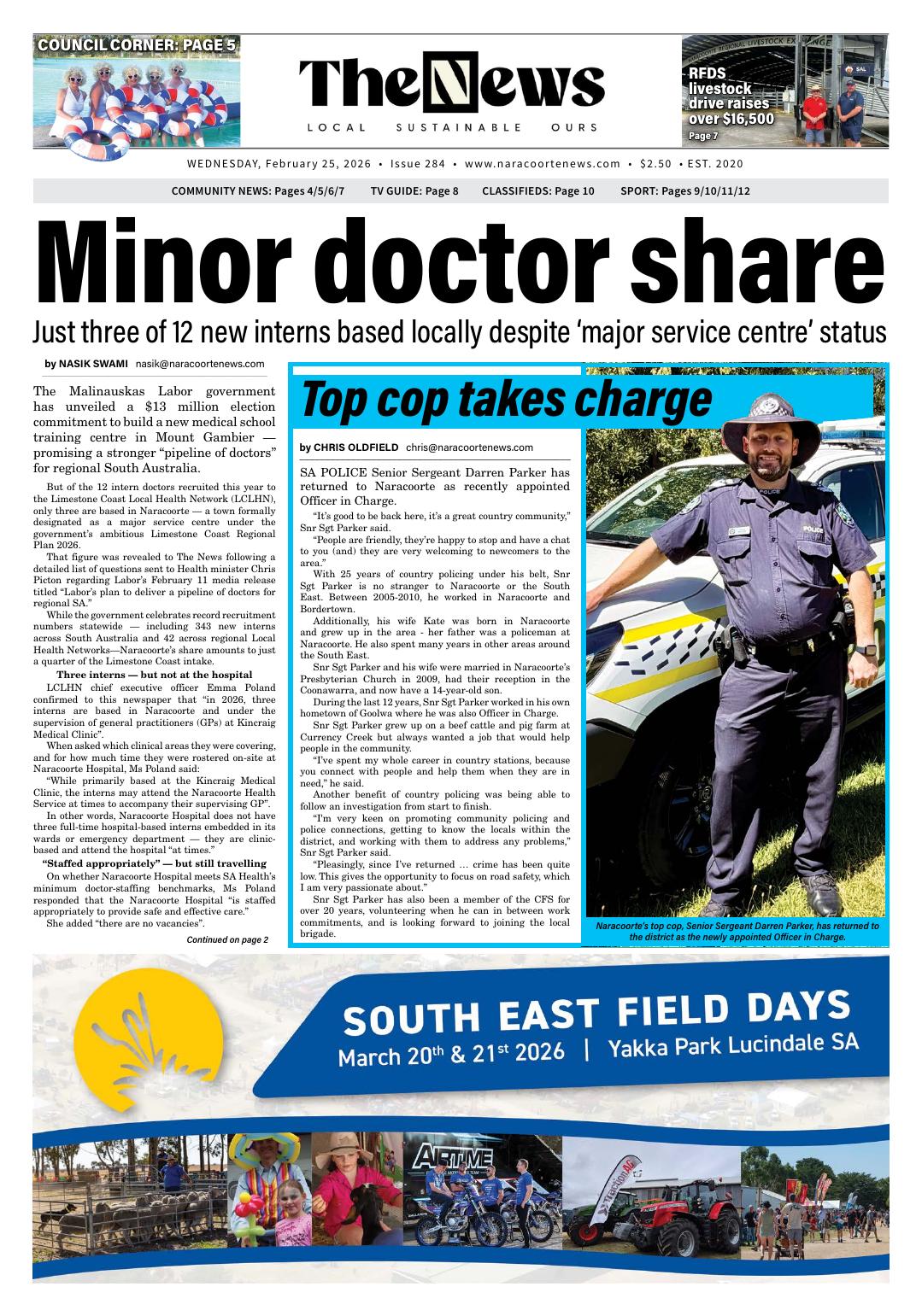 NewsOut now - Archive - February 2026SA The Naracoorte News, 25 February 2026 By Michael Waite, Naracoorte Community News 25 February 2026 Recent stories Right royal award for a guinea pig lover Coast Community News - Labor Government must act on wine crisis to help fuel crisis: Canavan, Chester Contributor, ARR.News - Renewables lift supply share as batteries re-shape energy markets: AEMO Contributor, ARR.News - Westbrook ANZAC service still growing Ted Rogers, On Our Selection News - Strong turnout for ANZAC Day Coast Community News - Reflection and remembrance on the Mount The Buloke Times - Cadets honoured with memorial role Mark Collins, Corryong Courier - Our fallen will never be forgotten Mark Collins, Corryong Courier - River Country Art Trail unveiled Contributor, The Koondrook and Barham Bridge Newspaper - Faster environmental approvals with states and territories: Albanese, Watt Contributor, ARR.News - Rabobank commentary: food price inflation remains entrenched above three per cent Contributor, ARR.News - Students gain insight into engineering careers Narrandera Argus - Epic Fury and Ukrainian farmers: Who will win? Pavel Kuliuk, ARR.News - Farmland prices set for continued “modest” growth in year ahead – Rabobank Contributor, ARR.News - Agricultural industry bodies seek amendments to proposed legislative reform to maintain protections for Condamine Alluvium groundwater system critical for farmers and rural communities: QFF Contributor, ARR.News - Load more Michael Waite, Naracoorte Community Newshttps://www.naracoortenews.com/ Out now!Buy here! I Subscribe here! Please leave this field emptyKEEP IN TOUCH Sign up for updates from Australian Rural & Regional News Manage your subscription We don’t spam! Read our privacy policy for more info. Thank you for subscribing for updates from Australian Rural & Regional News! By default you will receive all our newsletters. If you'd prefer to choose which newsletters you receive, go to the manage your subscription page make your selection. I'd love to hear from you if you have any feedback on the newsletter or the news platform or the news itself. Best Wishes, Fiona Fox The Editor Share FacebookLinkedinXPinterestWhatsAppEmailReddIt Previous articleYorke Peninsula Country Times, 24 February 2026Next articleThe Riverine Grazier, 25 February 2026 For all the news from Naracoorte Community News, go to https://www.naracoortenews.com/ Out Now! The Buloke Times, 30 April 2026 The Buloke Times - On Our Selection News, 30 April 2026 Ted Rogers, On Our Selection News - Narrandera Argus, 30 April 2026 Narrandera Argus - Corryong Courier, 30 April 2026 Mark Collins, Corryong Courier - Coast Community News, 30 April 2026 Coast Community News - The Koondrook and Barham Bridge Newspaper, 30 April 2026 Lloyd Polkinghorne, The Koondrook and Barham Bridge Newspaper - Allora Advertiser, 29 April 2026 Mim Rogers, Allora Advertiser - Yorke Peninsula Country Times, 28 April 2026 Yorke Peninsula Country Times - See all Latest stories from Naracoorte Community News on ARR.News Tiny piece wins big for Nicole Contributor, Naracoorte Community News - 29 April 2026 Iconic Kincraig reopens Contributor, Naracoorte Community News - 23 April 2026 Naracoorte’s rising star Nasik Swami, Naracoorte Community News - 15 April 2026 I am ready to get to work Nasik Swami, Naracoorte Community News - 8 April 2026 Mayor pay push splits council Nasik Swami, Naracoorte Community News - 1 April 2026 “I am sorry” – McBride ends political career Nasik Swami, Naracoorte Community News - 25 March 2026 NLC supports cave research Chris Oldfield, Naracoorte Community News - 18 March 2026 Who will it be? Nine-way race for MacKillop Nasik Swami, Naracoorte Community News - 11 March 2026 Load more