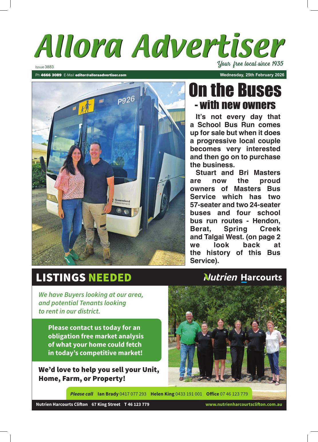 NewsOut now - Archive - February 2026Qld Allora Advertiser, 25 February 2026 By Mim Rogers, Allora Advertiser 26 February 2026 Recent stories Right royal award for a guinea pig lover Coast Community News - Labor Government must act on wine crisis to help fuel crisis: Canavan, Chester Contributor, ARR.News - Renewables lift supply share as batteries re-shape energy markets: AEMO Contributor, ARR.News - Westbrook ANZAC service still growing Ted Rogers, On Our Selection News - Strong turnout for ANZAC Day Coast Community News - Reflection and remembrance on the Mount The Buloke Times - Cadets honoured with memorial role Mark Collins, Corryong Courier - Our fallen will never be forgotten Mark Collins, Corryong Courier - River Country Art Trail unveiled Contributor, The Koondrook and Barham Bridge Newspaper - Faster environmental approvals with states and territories: Albanese, Watt Contributor, ARR.News - Rabobank commentary: food price inflation remains entrenched above three per cent Contributor, ARR.News - Students gain insight into engineering careers Narrandera Argus - Epic Fury and Ukrainian farmers: Who will win? Pavel Kuliuk, ARR.News - Farmland prices set for continued “modest” growth in year ahead – Rabobank Contributor, ARR.News - Agricultural industry bodies seek amendments to proposed legislative reform to maintain protections for Condamine Alluvium groundwater system critical for farmers and rural communities: QFF Contributor, ARR.News - Load more Mim Rogers, Allora Advertiserhttps://www.our-news.com.au/allora-advertiser Out now! Please leave this field emptyKEEP IN TOUCH Sign up for updates from Australian Rural & Regional News Manage your subscription We don’t spam! Read our privacy policy for more info. Thank you for subscribing for updates from Australian Rural & Regional News! By default you will receive all our newsletters. If you'd prefer to choose which newsletters you receive, go to the manage your subscription page make your selection. I'd love to hear from you if you have any feedback on the newsletter or the news platform or the news itself. Best Wishes, Fiona Fox The Editor Share FacebookLinkedinXPinterestWhatsAppEmailReddIt Previous articleNarrandera Argus, 26 February 2026Next articleOn Our Selection News, 26 February 2026 For all the news from the Allora Advertiser, go to https://www.our-news.com.au/allora-advertiser Out Now! The Buloke Times, 30 April 2026 The Buloke Times - On Our Selection News, 30 April 2026 Ted Rogers, On Our Selection News - Narrandera Argus, 30 April 2026 Narrandera Argus - Corryong Courier, 30 April 2026 Mark Collins, Corryong Courier - Coast Community News, 30 April 2026 Coast Community News - The Koondrook and Barham Bridge Newspaper, 30 April 2026 Lloyd Polkinghorne, The Koondrook and Barham Bridge Newspaper - Allora Advertiser, 29 April 2026 Mim Rogers, Allora Advertiser - Yorke Peninsula Country Times, 28 April 2026 Yorke Peninsula Country Times - See all Latest stories from the Allora Advertiser on ARR.News The Salvation Army Corps 106 year participation in Allora’s ANZAC Day commemorations comes to an end Mim Rogers, Allora Advertiser - 24 April 2026 Old wool table now looks classy Mim Rogers, Allora Advertiser - 17 April 2026 Fuel relief measures miss the mark for ag sector Mim Rogers, Allora Advertiser - 10 April 2026 Rainbow Lorikeets Easter treat Mim Rogers, Allora Advertiser - 10 April 2026 Anger at Allora fuel depot Mim Rogers, Allora Advertiser - 2 April 2026 Ag Discovery Day returns to Toowoomba Royal Show Mim Rogers, Allora Advertiser - 27 March 2026 Allora welcomes the Gentle Giants Mim Rogers, Allora Advertiser - 20 March 2026 A story of courage and determination Mim Rogers, Allora Advertiser - 20 March 2026 Load more