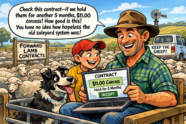 What’s the point of having the rural press reporting excitedly about “record lamb prices,” if it’s only one pen? Cameras flash, agents celebrate and processors politely shrug knowing that the average will be in their favour. But the economics of the industry are not built on the occasional headline. Lamb is ultimately priced on kilograms of carcass sold into domestic and export contracts that processors have visibility on months in advance. But when saleyard prices lurch week to week, much of that movement is noise rather than genuine price discovery of value for producers.