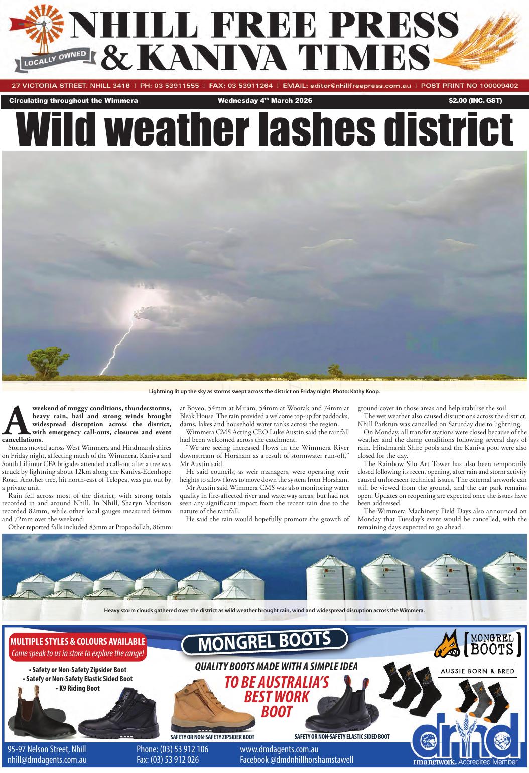 NewsOut now - Archive - March 2026Vic Nhill Free Press & Kaniva Times, 4 March 2026 By Emily Gladdis, Nhill Free Press & Kaniva Times 4 March 2026 Recent stories Right royal award for a guinea pig lover Coast Community News - Labor Government must act on wine crisis to help fuel crisis: Canavan, Chester Contributor, ARR.News - Renewables lift supply share as batteries re-shape energy markets: AEMO Contributor, ARR.News - Westbrook ANZAC service still growing Ted Rogers, On Our Selection News - Strong turnout for ANZAC Day Coast Community News - Reflection and remembrance on the Mount The Buloke Times - Cadets honoured with memorial role Mark Collins, Corryong Courier - Our fallen will never be forgotten Mark Collins, Corryong Courier - River Country Art Trail unveiled Contributor, The Koondrook and Barham Bridge Newspaper - Faster environmental approvals with states and territories: Albanese, Watt Contributor, ARR.News - Rabobank commentary: food price inflation remains entrenched above three per cent Contributor, ARR.News - Students gain insight into engineering careers Narrandera Argus - Epic Fury and Ukrainian farmers: Who will win? Pavel Kuliuk, ARR.News - Farmland prices set for continued “modest” growth in year ahead – Rabobank Contributor, ARR.News - Agricultural industry bodies seek amendments to proposed legislative reform to maintain protections for Condamine Alluvium groundwater system critical for farmers and rural communities: QFF Contributor, ARR.News - Load more Emily Gladdis, Nhill Free Press & Kaniva Timeshttps://www.nhillfreepress.com.au Out now! Subscribe here! Please leave this field emptyKEEP IN TOUCH Sign up for updates from Australian Rural & Regional News Manage your subscription We don’t spam! Read our privacy policy for more info. Thank you for subscribing for updates from Australian Rural & Regional News! By default you will receive all our newsletters. If you'd prefer to choose which newsletters you receive, go to the manage your subscription page make your selection. I'd love to hear from you if you have any feedback on the newsletter or the news platform or the news itself. Best Wishes, Fiona Fox The Editor Share FacebookLinkedinXPinterestWhatsAppEmailReddIt Previous articleThe Naracoorte News, 4 March 2026Next articleThe Riverine Grazier, 4 March 2026 For all the news from Nhill Free Press & Kaniva Times, go to https://www.nhillfreepress.com.au Out Now! The Buloke Times, 30 April 2026 The Buloke Times - On Our Selection News, 30 April 2026 Ted Rogers, On Our Selection News - Narrandera Argus, 30 April 2026 Narrandera Argus - Corryong Courier, 30 April 2026 Mark Collins, Corryong Courier - Coast Community News, 30 April 2026 Coast Community News - The Koondrook and Barham Bridge Newspaper, 30 April 2026 Lloyd Polkinghorne, The Koondrook and Barham Bridge Newspaper - Allora Advertiser, 29 April 2026 Mim Rogers, Allora Advertiser - Yorke Peninsula Country Times, 28 April 2026 Yorke Peninsula Country Times - See all Latest stories from Nhill Free Press & Kaniva Times on ARR.News ANZAC Day 2026 Emily Gladdis, Nhill Free Press & Kaniva Times - 29 April 2026 Getting Ready for ANZAC Day 2026 Emily Gladdis, Nhill Free Press & Kaniva Times - 23 April 2026 Grandstand opening Emily Gladdis, Nhill Free Press & Kaniva Times - 15 April 2026 Ava’s fight highlights value of Good Friday Appeal Emily Gladdis, Nhill Free Press & Kaniva Times - 8 April 2026 Harmony Day Emily Gladdis, Nhill Free Press & Kaniva Times - 1 April 2026 From lockdown hobby to gallery walls Emily Gladdis, Nhill Free Press & Kaniva Times - 25 March 2026 Warriors clinch title Emily Gladdis, Nhill Free Press & Kaniva Times - 18 March 2026 Gallery Central featured artist: Peter’s pottery Emily Gladdis, Nhill Free Press & Kaniva Times - 11 March 2026 Load more