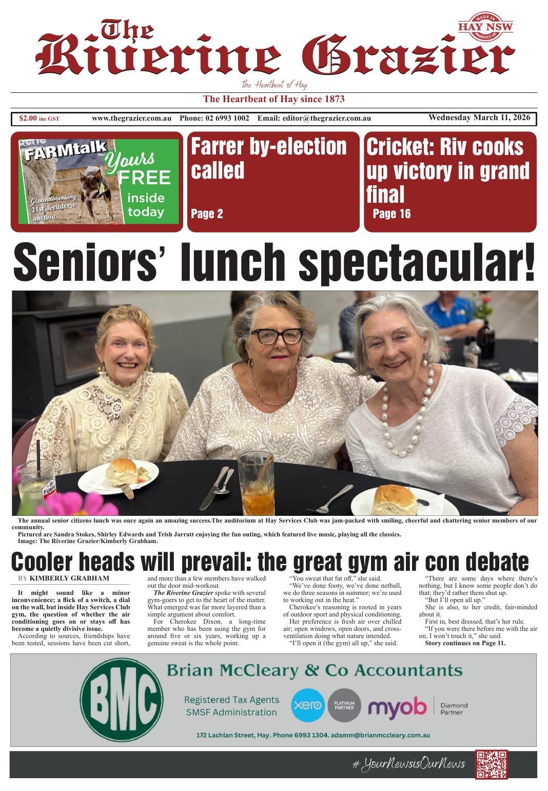 NewsNSWOut now - Archive - March 2026 The Riverine Grazier, 11 March 2026 By Krista Schade, The Riverine Grazier 11 March 2026 Recent stories Council is running effectively – OLG Rodney Stevens, Clarence Valley Independent - Newstead medical physicist grateful to help community Contributor, Tarrangower Times - Old wool table now looks classy Mim Rogers, Allora Advertiser - New Australia-United Kingdom MOU to unlock more investment: Chalmers, Reeves Contributor, ARR.News - Country Cabinet to continue under re-elected Malinauskas Government: Malinauskas Contributor, ARR.News - Public artwork commission to celebrate Loddon riverbanks Contributor, ARR.News - Don’t risk a bite to the hand that feeds Contributor, ARR.News - Watch My Cousin Frank on SBS On Demand: NORPA Contributor, ARR.News - Welcoming Hurford Hardwood as a NORPA Partner: NORPA Contributor, ARR.News - Killing koalas with kindness: Vic Jurskis Vic Jurskis - Opening smarter pathways to cut landfill emissions and earn ACCU revenue: Wilson Contributor, ARR.News - Light Horse skills not lost Mark Collins, Corryong Courier - Environmental surveys continue Contributor, The Buloke Times - Farmers’ rights eroded Contributor, The Buloke Times - Fuel crisis hits hard Narrandera Argus - Load more Krista Schade, The Riverine Grazierhttps://www.thegrazier.com.au Out now! Subscribe here! Please leave this field emptyKEEP IN TOUCH Sign up for updates from Australian Rural & Regional News Manage your subscription We don’t spam! Read our privacy policy for more info. Thank you for subscribing for updates from Australian Rural & Regional News! By default you will receive all our newsletters. If you'd prefer to choose which newsletters you receive, go to the manage your subscription page make your selection. I'd love to hear from you if you have any feedback on the newsletter or the news platform or the news itself. Best Wishes, Fiona Fox The Editor Share FacebookLinkedinXPinterestWhatsAppEmailReddIt Previous articleNhill Free Press & Kaniva Times, 11 March 2026Next articleMurray Pioneer, 11 March 2026 For all the news from The Riverine Grazier, go to https://www.thegrazier.com.au Out Now! Tarrangower Times, 17 April 2026 Tarrangower Times - Clarence Valley Independent, 17 April 2026 Clarence Valley Independent - Corryong Courier, 16 April 2026 Mark Collins, Corryong Courier - Narrandera Argus, 16 April 2026 Narrandera Argus - On Our Selection News, 16 April 2026 Ted Rogers, On Our Selection News - The Buloke Times, 16 April 2026 The Buloke Times - Coast Community News, 16 April 2026 Coast Community News - The Koondrook and Barham Bridge Newspaper, 16 April 2026 Lloyd Polkinghorne, The Koondrook and Barham Bridge Newspaper - See all Latest stories from The Riverine Grazier on ARR.News Dinawan Solar Farm approved despite strong objections Tertia Butcher, The Riverine Grazier - 15 April 2026 ‘A piece of paper in the wind’ – Part One of shining a light on Hay’s homelessness issue Kimberly Grabham, The Riverine Grazier - 8 April 2026 Council prepares to launch 10-year plan, reflecting economic transition Tertia Butcher, The Riverine Grazier - 1 April 2026 I am not a Harvard graduate – One Nation candidate David Farley Kimberly Grabham, The Riverine Grazier - 25 March 2026 Building an empire, one agri opportunity at a time Tertia Butcher, The Riverine Grazier - 18 March 2026 Tiny homes project changing lives of young students Kimberly Grabham, The Riverine Grazier - 11 March 2026 The stink about releasing the carp virus Krista Schade, The Riverine Grazier - 4 March 2026 EnergyCo needs a shake-up Tertia Butcher, The Riverine Grazier - 25 February 2026 Load more