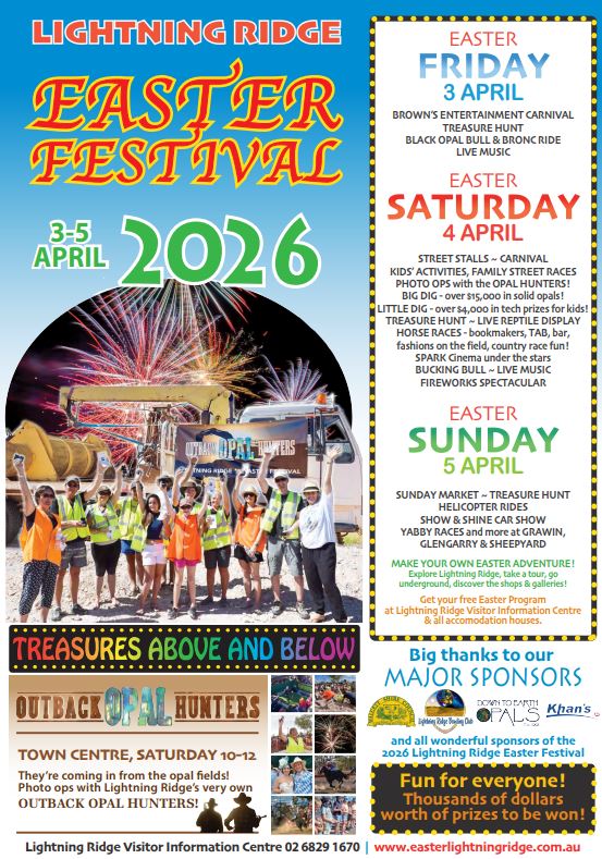 Printed programs will be available at accommodation houses and the Lightning Ridge Visitor Centre during Easter week — or head online now to check out the full event lineup, external links, and event contacts.