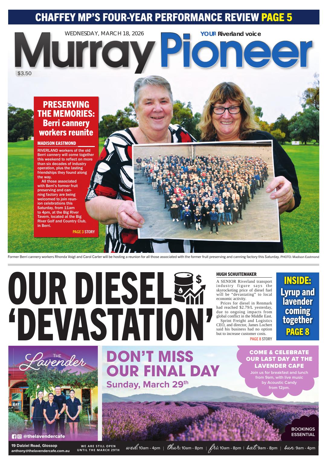 NewsOut now - Archive - March 2026SA Murray Pioneer, 18 March 2026 By Murray Pioneer 18 March 2026 Recent stories Opening smarter pathways to cut landfill emissions and earn ACCU revenue: Wilson Contributor, ARR.News - Light Horse skills not lost Mark Collins, Corryong Courier - Environmental surveys continue Contributor, The Buloke Times - Farmers’ rights eroded Contributor, The Buloke Times - Fuel crisis hits hard Narrandera Argus - Ramsay local to captain Queensland Polocrosse team Ted Rogers, On Our Selection News - Getting fertiliser to farmers faster: Collins Contributor, ARR.News - $3 million boost drives groundbreaking koala research in Port Stephens: Watt, Swanson Contributor, ARR.News - Whales are making an appearance Coast Community News - Cohuna turns out for barefoot titles opener Contributor, The Koondrook and Barham Bridge Newspaper - Farmer left bone dry after fuel theft Contributor, The Koondrook and Barham Bridge Newspaper - LambEx26 program launch Contributor, ARR.News - Radical Right v Radical Left and the threat of the Age of Unreason Kookaburra, ARR.News - Renewed effort to supercharge faba bean breeding and expansion: GRDC Contributor, ARR.News - Elders bales on WA wool growers – Just the tip of the iceberg: Geoff Pearson WAFarmers Contributor, ARR.News - Load more Murray Pioneerhttps://www.murraypioneer.com.au Out now! Subscribe here! Please leave this field emptyKEEP IN TOUCH Sign up for updates from Australian Rural & Regional News Manage your subscription We don’t spam! Read our privacy policy for more info. Thank you for subscribing for updates from Australian Rural & Regional News! By default you will receive all our newsletters. If you'd prefer to choose which newsletters you receive, go to the manage your subscription page make your selection. I'd love to hear from you if you have any feedback on the newsletter or the news platform or the news itself. Best Wishes, Fiona Fox The Editor Share FacebookLinkedinXPinterestWhatsAppEmailReddIt Previous articleNhill Free Press & Kaniva Times, 18 March 2026Next articleWorld desperate for Queensland resources, LNP Government still says no! : Robbie Katter For all the news from the Murray Pioneer, go to https://www.murraypioneer.com.au Out Now! Corryong Courier, 16 April 2026 Mark Collins, Corryong Courier - Narrandera Argus, 16 April 2026 Narrandera Argus - On Our Selection News, 16 April 2026 Ted Rogers, On Our Selection News - The Buloke Times, 16 April 2026 The Buloke Times - Coast Community News, 16 April 2026 Coast Community News - The Koondrook and Barham Bridge Newspaper, 16 April 2026 Lloyd Polkinghorne, The Koondrook and Barham Bridge Newspaper - Allora Advertiser, 15 April 2026 Mim Rogers, Allora Advertiser - Murray Pioneer, 15 April 2026 Murray Pioneer - See all Latest stories from the Murray Pioneer on ARR.News Low – interest drought loans open with a warning for growers Murray Pioneer - 15 April 2026 BPS going into the future Murray Pioneer - 8 April 2026 Radio saved the Easter Carnival Murray Pioneer - 1 April 2026 Preference irony as Labor helps Tim over the line Murray Pioneer - 25 March 2026 Tim still on top Murray Pioneer - 25 March 2026 Coalition reunion shelved in Chaffey Murray Pioneer - 18 March 2026 Heat and rain hampering vintage Murray Pioneer - 11 March 2026 Panic at the bowser Murray Pioneer - 11 March 2026 Load more