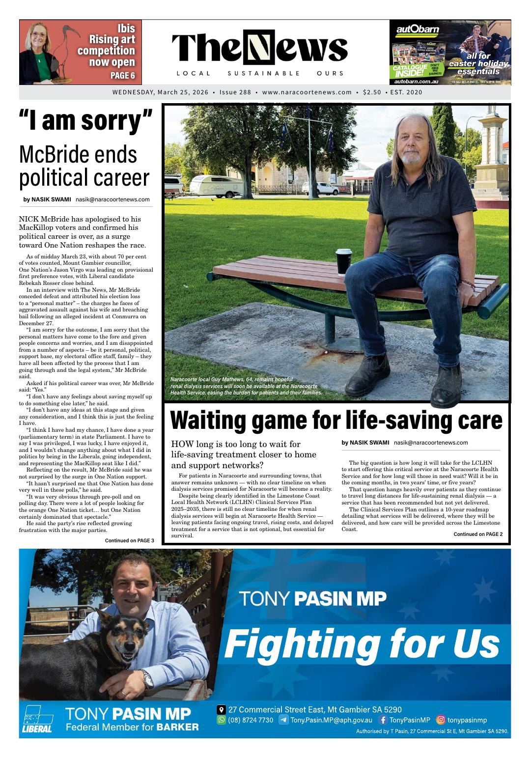 In an interview with The [Naracoorte] News, Mr McBride conceded defeat and attributed his election loss to a “personal matter” the charges he faces of aggravated assault against his wife and breaching bail following an alleged incident at Conmurra on December 27.