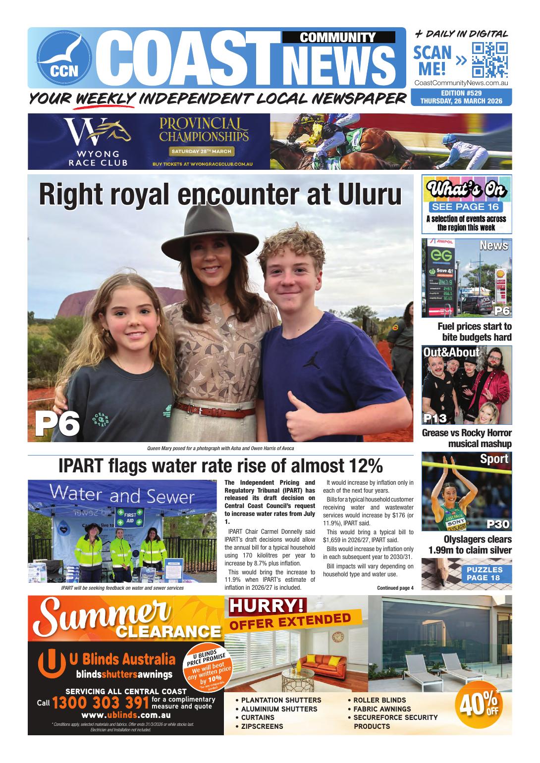NewsNSWOut now - Archive - March 2026 Coast Community News, 26 March 2026 By Coast Community News 26 March 2026 Recent stories Stansbury and Port Vincent turn it on for Saltwater Classic Yorke Peninsula Country Times - A better lifestyle through a stronger economy – Queensland back in business as Crisafulli Government unlocks major resources projects: Bleijie Contributor, ARR.News - Armidale event to explore what happens to solar panels at end of life Contributor, ARR.News - Cash is coming back as revealed by RBA survey: NSA Contributor, ARR.News - Global fertiliser market facing prolonged period of strain from Middle East disruption – industry report: Rabobank Contributor, ARR.News - Sheep collagen a wound heal wonder for people: AMPC Contributor, ARR.News - An ANZAC Day remembrance – Pacific Theatre World War 2 Dunoon and District Gazette - Dunoon United Football Club women flying high Dunoon and District Gazette - Making every kilogram of fertiliser count: Australian silicon solution aids farmers amid urea shortage The Editor - Clean water to flow for Narrandera – Coalition commits $16 million to new water treatment plant: Canavan, McCormack, Kovacic, Cooke Contributor, ARR.News - Norco lifts farmgate milk price, warns more support needed for farmers Contributor, ARR.News - It’s almost ANZAC Day, Pete Ramsey New Zealand Veterans Assoc drops in for a chat and James plays a song No Drama Farmer - It isn’t easy being green as solar panels go to waste: Webster Contributor, ARR.News - CLP boosting energy security with large scale batteries for Katherine and Alice Springs: Edgington Contributor, ARR.News - FuelWatch failure exposes Cook Government’s disconnect from regional WA: Hunter Contributor, ARR.News - Load more Coast Community Newshttps://coastcommunitynews.com.au Out now! Buy here! Please leave this field emptyKEEP IN TOUCH Sign up for updates from Australian Rural & Regional News Manage your subscription We don’t spam! Read our privacy policy for more info. Thank you for subscribing for updates from Australian Rural & Regional News! By default you will receive all our newsletters. If you'd prefer to choose which newsletters you receive, go to the manage your subscription page make your selection. I'd love to hear from you if you have any feedback on the newsletter or the news platform or the news itself. Best Wishes, Fiona Fox The Editor Share FacebookLinkedinXPinterestWhatsAppEmailReddIt Previous articleThe Buloke Times, 26 March 2026Next articleDenmark Bulletin, 26 March 2026 For all the news from Coast Community News, go to https://coastcommunitynews.com.au Out Now! Yorke Peninsula Country Times, 21 April 2026 Yorke Peninsula Country Times - Dunoon and District Gazette, April-May 2026 Dunoon and District Gazette - Tarrangower Times, 17 April 2026 Tarrangower Times - Clarence Valley Independent, 17 April 2026 Clarence Valley Independent - Corryong Courier, 16 April 2026 Mark Collins, Corryong Courier - Narrandera Argus, 16 April 2026 Narrandera Argus - On Our Selection News, 16 April 2026 Ted Rogers, On Our Selection News - The Buloke Times, 16 April 2026 The Buloke Times - See all Latest stories from Coast Community News on ARR.News Whales are making an appearance Coast Community News - 16 April 2026 The day the music died – Dave Price, 98 hangs up his clarinet Coast Community News - 9 April 2026 Families furious with 10 per cent rise in childcare fees Coast Community News - 2 April 2026 Right Royal encounter at Uluru Coast Community News - 26 March 2026 Cancer fundraising ride a family affair Coast Community News - 25 March 2026 No plans to privatise national parks Coast Community News - 19 March 2026 Minority councillors complain debate is gagged Coast Community News - 12 March 2026 Wyong’s Little Creek Cheese hauls in the medals Coast Community News - 6 March 2026 Load more