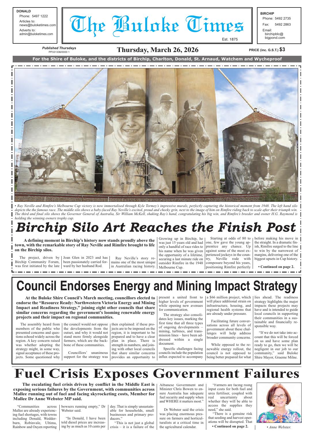 NewsOut now - Archive - March 2026Vic The Buloke Times, 26 March 2026 By The Buloke Times 26 March 2026 Recent stories Stansbury and Port Vincent turn it on for Saltwater Classic Yorke Peninsula Country Times - A better lifestyle through a stronger economy – Queensland back in business as Crisafulli Government unlocks major resources projects: Bleijie Contributor, ARR.News - Armidale event to explore what happens to solar panels at end of life Contributor, ARR.News - Cash is coming back as revealed by RBA survey: NSA Contributor, ARR.News - Global fertiliser market facing prolonged period of strain from Middle East disruption – industry report: Rabobank Contributor, ARR.News - Sheep collagen a wound heal wonder for people: AMPC Contributor, ARR.News - An ANZAC Day remembrance – Pacific Theatre World War 2 Dunoon and District Gazette - Dunoon United Football Club women flying high Dunoon and District Gazette - Making every kilogram of fertiliser count: Australian silicon solution aids farmers amid urea shortage The Editor - Clean water to flow for Narrandera – Coalition commits $16 million to new water treatment plant: Canavan, McCormack, Kovacic, Cooke Contributor, ARR.News - Norco lifts farmgate milk price, warns more support needed for farmers Contributor, ARR.News - It’s almost ANZAC Day, Pete Ramsey New Zealand Veterans Assoc drops in for a chat and James plays a song No Drama Farmer - It isn’t easy being green as solar panels go to waste: Webster Contributor, ARR.News - CLP boosting energy security with large scale batteries for Katherine and Alice Springs: Edgington Contributor, ARR.News - FuelWatch failure exposes Cook Government’s disconnect from regional WA: Hunter Contributor, ARR.News - Load more The Buloke Timeshttps://www.buloketimes.com Out now!Buy here! I Subscribe here! Please leave this field emptyKEEP IN TOUCH Sign up for updates from Australian Rural & Regional News Manage your subscription We don’t spam! Read our privacy policy for more info. Thank you for subscribing for updates from Australian Rural & Regional News! By default you will receive all our newsletters. If you'd prefer to choose which newsletters you receive, go to the manage your subscription page make your selection. I'd love to hear from you if you have any feedback on the newsletter or the news platform or the news itself. Best Wishes, Fiona Fox The Editor Share FacebookLinkedinXPinterestWhatsAppEmailReddIt Previous articleOn Our Selection News, 26 March 2026Next articleCoast Community News, 26 March 2026 For all the news from The Buloke Times, go to https://www.buloketimes.com/ Out Now! Yorke Peninsula Country Times, 21 April 2026 Yorke Peninsula Country Times - Dunoon and District Gazette, April-May 2026 Dunoon and District Gazette - Tarrangower Times, 17 April 2026 Tarrangower Times - Clarence Valley Independent, 17 April 2026 Clarence Valley Independent - Corryong Courier, 16 April 2026 Mark Collins, Corryong Courier - Narrandera Argus, 16 April 2026 Narrandera Argus - On Our Selection News, 16 April 2026 Ted Rogers, On Our Selection News - The Buloke Times, 16 April 2026 The Buloke Times - See all Latest stories from The Buloke Times on ARR.News Environmental surveys continue Contributor, The Buloke Times - 16 April 2026 Farmers’ rights eroded Contributor, The Buloke Times - 16 April 2026 In its 75th year – CFA raises $2.1 million for sick kids The Buloke Times - 9 April 2026 More murals for Donald Contributor, The Buloke Times - 2 April 2026 Birchip silo art reaches finish post The Buloke Times - 26 March 2026 A lifetime of achievements awarded The Buloke Times - 19 March 2026 Art and culture shine at Mali Heart Festival The Buloke Times - 12 March 2026 Ripper rainfall across the region The Buloke Times - 5 March 2026 Load more
