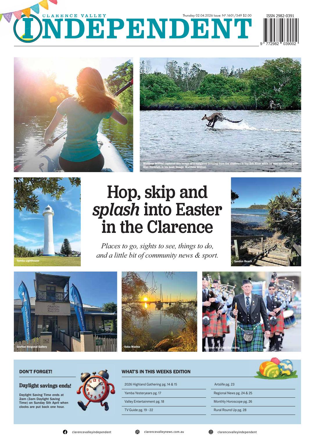 NewsNSWOut now - Archive - April 2026 Clarence Valley Independent, 2 April 2026 By Clarence Valley Independent 2 April 2026 Recent stories Upcoming webinar – What’s it take to develop offshore wind in Australia? Blue Economy CRC Contributor, ARR.News - Restoration brings Flinders and Freycinet statues back to life Contributor, ARR.News - Delivering free GP appointments for Northern Tasmania: Archer Contributor, ARR.News - Seven Cities to drive next wave of regional economic development: Cook, Dawson Contributor, ARR.News - Territory positions itself at centre of national defence push: Finocchiaro Contributor, ARR.News - SLSNSW distributes publicly accessible shark bite kits to all NSW surf clubs: SLSNSW Contributor, ARR.News - Queensland Dinosaur Week 2026 roars into Hughenden and Flinders Shire Contributor, ARR.News - Banks must dump Environmental, Social and Governance ‘woke’ agenda for coal, gas and oil: McDonald, Canavan, Hogan Contributor, ARR.News - Millie, the BreastScreenNT bus to complete final tour in 2026: NT Health Contributor, ARR.News - When ideology meets the fuel tank Trevor Whittington, CEO WAFarmers - ANZAC Special, plus we get the debrief on Buddy suiting up for Dowerin with Tracy Jones! No Drama Farmer - Editor is Lismore Local Woman of the Year Contributor, indyNR.com - Algal bloom testing results continue positive trend: Malinauskas, Scriven Contributor, ARR.News - Rare native lilies spotted flowering on stock reserve north of Deniliquin Kimberly Grabham, Back Country Bulletin - ANZAC Day a good time to gauge Middle East crisis Erwin Chlanda, Alice Springs News - Load more Clarence Valley Independenthttps://clarencevalleynews.com.au/ Out now! Buy here! Please leave this field emptyKEEP IN TOUCH Sign up for updates from Australian Rural & Regional News Manage your subscription We don’t spam! Read our privacy policy for more info. Thank you for subscribing for updates from Australian Rural & Regional News! By default you will receive all our newsletters. If you'd prefer to choose which newsletters you receive, go to the manage your subscription page make your selection. I'd love to hear from you if you have any feedback on the newsletter or the news platform or the news itself. Best Wishes, Fiona Fox The Editor Share FacebookLinkedinXPinterestWhatsAppEmailReddIt Previous articleOn Our Selection News, 2 April 2026Next articleTarrangower Times, 2 April 2026 For all the news from the Clarence Valley Independent, go to https://clarencevalleynews.com.au/ Out Now! Yorke Peninsula Country Times, 28 April 2026 Yorke Peninsula Country Times - Murray Pioneer, 29 April 2026 Murray Pioneer - Kyogle News INKY, 29 April 2026 Susanna Freymark, indyNR.com - The Riverine Grazier, 29 April 2026 Krista Schade, The Riverine Grazier - Nhill Free Press & Kaniva Times, 29 April 2026 Emily Gladdis, Nhill Free Press & Kaniva Times - The Naracoorte News, 29 April 2026 Michael Waite, Naracoorte Community News - Tarrangower Times, 24 April 2026 Tarrangower Times - Clarence Valley Independent, 24 April 2026 Clarence Valley Independent - See all Latest stories from the Clarence Valley Independent on ARR.News “Price crunch” – societal implications of conflict Rodney Stevens, Clarence Valley Independent - 24 April 2026 Council is running effectively – OLG Rodney Stevens, Clarence Valley Independent - 17 April 2026 International affair at Highland Gathering Rodney Stevens, Clarence Valley Independent - 10 April 2026 121st Maclean Highland Gathering Rodney Stevens, Clarence Valley Independent - 2 April 2026 Unanimous vote shows what matters Emma Pritchard, Clarence Valley Independent - 27 March 2026 Sparkling moment as new Assistant Bishop consecrated Emma Pritchard, Clarence Valley Independent - 20 March 2026 Bluesfest in liquidation, 2026 cancelled Rodney Stevens, Clarence Valley Independent - 20 March 2026 Celebrating our local women Contributor, Clarence Valley Independent - 13 March 2026 Load more