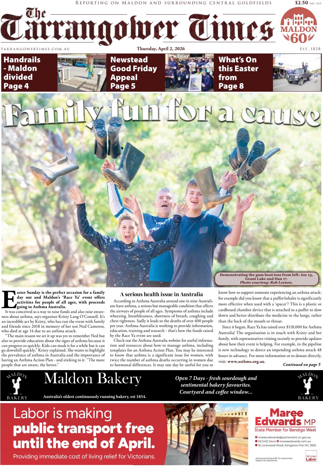 NewsOut now - Archive - April 2026Vic Tarrangower Times, 2 April 2026 By Tarrangower Times 2 April 2026 Recent stories Upcoming webinar – What’s it take to develop offshore wind in Australia? Blue Economy CRC Contributor, ARR.News - Restoration brings Flinders and Freycinet statues back to life Contributor, ARR.News - Delivering free GP appointments for Northern Tasmania: Archer Contributor, ARR.News - Seven Cities to drive next wave of regional economic development: Cook, Dawson Contributor, ARR.News - Territory positions itself at centre of national defence push: Finocchiaro Contributor, ARR.News - SLSNSW distributes publicly accessible shark bite kits to all NSW surf clubs: SLSNSW Contributor, ARR.News - Queensland Dinosaur Week 2026 roars into Hughenden and Flinders Shire Contributor, ARR.News - Banks must dump Environmental, Social and Governance ‘woke’ agenda for coal, gas and oil: McDonald, Canavan, Hogan Contributor, ARR.News - Millie, the BreastScreenNT bus to complete final tour in 2026: NT Health Contributor, ARR.News - When ideology meets the fuel tank Trevor Whittington, CEO WAFarmers - ANZAC Special, plus we get the debrief on Buddy suiting up for Dowerin with Tracy Jones! No Drama Farmer - Editor is Lismore Local Woman of the Year Contributor, indyNR.com - Algal bloom testing results continue positive trend: Malinauskas, Scriven Contributor, ARR.News - Rare native lilies spotted flowering on stock reserve north of Deniliquin Kimberly Grabham, Back Country Bulletin - ANZAC Day a good time to gauge Middle East crisis Erwin Chlanda, Alice Springs News - Load more Tarrangower Timeshttps://www.tarrangowertimes.com.au/ Out now! Buy here! I Subscribe here! Please leave this field emptyKEEP IN TOUCH Sign up for updates from Australian Rural & Regional News Manage your subscription We don’t spam! Read our privacy policy for more info. Thank you for subscribing for updates from Australian Rural & Regional News! By default you will receive all our newsletters. If you'd prefer to choose which newsletters you receive, go to the manage your subscription page make your selection. I'd love to hear from you if you have any feedback on the newsletter or the news platform or the news itself. Best Wishes, Fiona Fox The Editor Share FacebookLinkedinXPinterestWhatsAppEmailReddIt Previous articleClarence Valley Independent, 2 April 2026Next articleThe National Digital Twin for Australian Agriculture – the best yet investigative tool For all the news from the Tarrangower Times, go to https://www.tarrangowertimes.com.au/ Out Now! Yorke Peninsula Country Times, 28 April 2026 Yorke Peninsula Country Times - Murray Pioneer, 29 April 2026 Murray Pioneer - Kyogle News INKY, 29 April 2026 Susanna Freymark, indyNR.com - The Riverine Grazier, 29 April 2026 Krista Schade, The Riverine Grazier - Nhill Free Press & Kaniva Times, 29 April 2026 Emily Gladdis, Nhill Free Press & Kaniva Times - The Naracoorte News, 29 April 2026 Michael Waite, Naracoorte Community News - Tarrangower Times, 24 April 2026 Tarrangower Times - Clarence Valley Independent, 24 April 2026 Clarence Valley Independent - See all Latest stories from the Tarrangower Times on ARR.News 110 Years of ANZAC Hill Contributor, Tarrangower Times - 24 April 2026 Play offers rare glimpse into view from the edge Michelle Dorian, Tarrangower Times - 24 April 2026 Newstead medical physicist grateful to help community Contributor, Tarrangower Times - 17 April 2026 Easter Maldon style Michelle Dorian, Tarrangower Times - 10 April 2026 Maldon battery: MP reflects Michelle Dorian, Tarrangower Times - 2 April 2026 Harmony in action at Castlemaine State Festival Michelle Dorian, Tarrangower Times - 27 March 2026 War fuels anxiety Michelle Dorian, Tarrangower Times - 27 March 2026 Traces: unique arts experience at Castlemaine Festival Contributor, Tarrangower Times - 20 March 2026 Load more