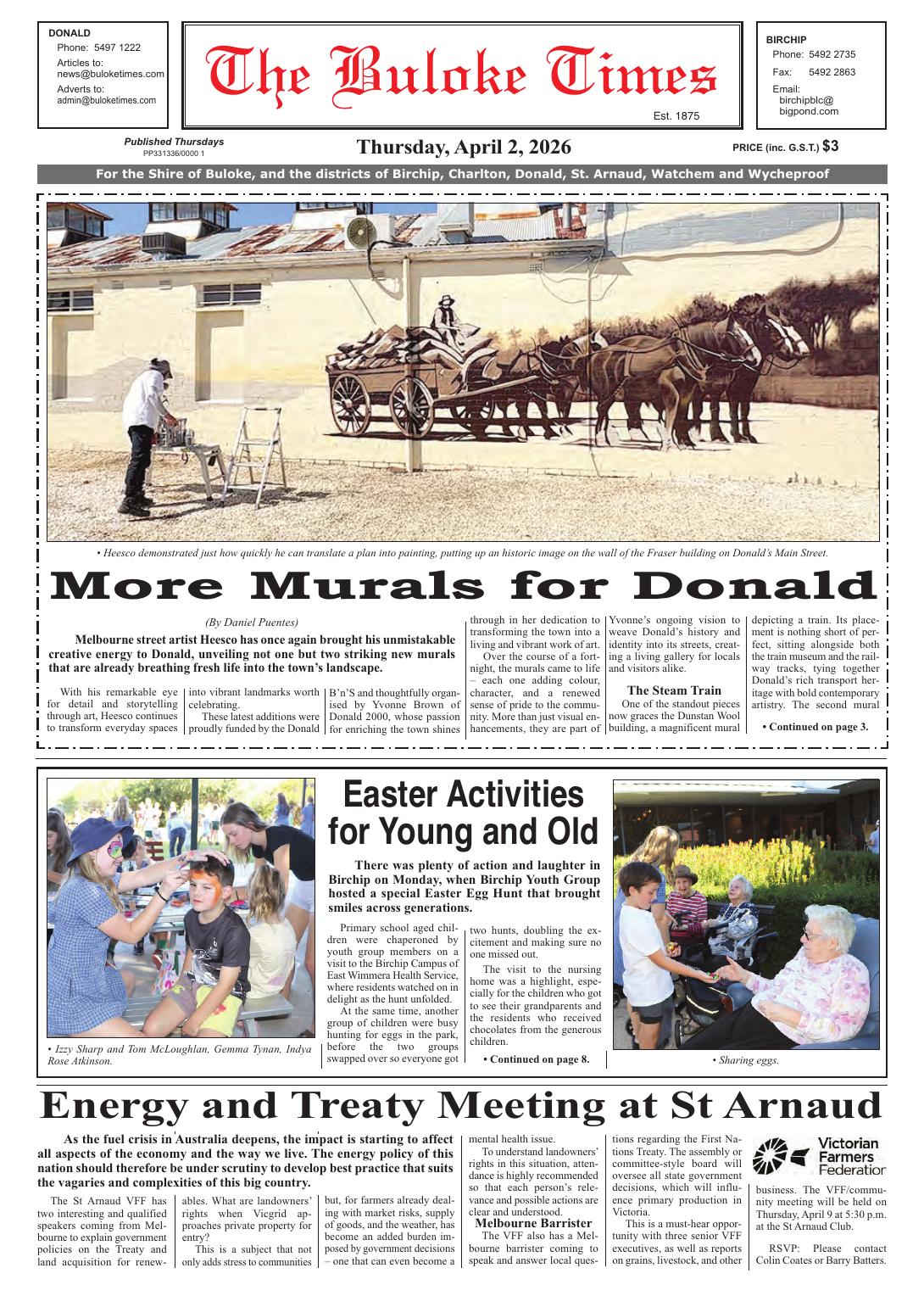 NewsOut now - Archive - April 2026Vic The Buloke Times, 2 April 2026 By The Buloke Times 2 April 2026 Recent stories Gas exploration safeguards questioned: NSW Farmers Association Contributor, ARR.News - Narungga to benefit from ‘real power’ Yorke Peninsula Country Times - Dawn of honour Yorke Peninsula Country Times - No more trust Murray Pioneer - ANZAC Day provides opportunity to pause for reflection Krista Schade, The Riverine Grazier - ANZAC Day 2026 Emily Gladdis, Nhill Free Press & Kaniva Times - Tiny piece wins big for Nicole Contributor, Naracoorte Community News - Upcoming webinar – What’s it take to develop offshore wind in Australia? Blue Economy CRC Contributor, ARR.News - Restoration brings Flinders and Freycinet statues back to life Contributor, ARR.News - Delivering free GP appointments for Northern Tasmania: Archer Contributor, ARR.News - Seven Cities to drive next wave of regional economic development: Cook, Dawson Contributor, ARR.News - Territory positions itself at centre of national defence push: Finocchiaro Contributor, ARR.News - SLSNSW distributes publicly accessible shark bite kits to all NSW surf clubs: SLSNSW Contributor, ARR.News - Queensland Dinosaur Week 2026 roars into Hughenden and Flinders Shire Contributor, ARR.News - Banks must dump Environmental, Social and Governance ‘woke’ agenda for coal, gas and oil: McDonald, Canavan, Hogan Contributor, ARR.News - Load more The Buloke Timeshttps://www.buloketimes.com Out now!Buy here! I Subscribe here! Please leave this field emptyKEEP IN TOUCH Sign up for updates from Australian Rural & Regional News Manage your subscription We don’t spam! Read our privacy policy for more info. Thank you for subscribing for updates from Australian Rural & Regional News! By default you will receive all our newsletters. If you'd prefer to choose which newsletters you receive, go to the manage your subscription page make your selection. I'd love to hear from you if you have any feedback on the newsletter or the news platform or the news itself. Best Wishes, Fiona Fox The Editor Share FacebookLinkedinXPinterestWhatsAppEmailReddIt Previous articleCoast Community News, 2 April 2026Next articleAllora Advertiser, 1 April 2026 For all the news from The Buloke Times, go to https://www.buloketimes.com/ Out Now! Yorke Peninsula Country Times, 28 April 2026 Yorke Peninsula Country Times - Murray Pioneer, 29 April 2026 Murray Pioneer - Kyogle News INKY, 29 April 2026 Susanna Freymark, indyNR.com - The Riverine Grazier, 29 April 2026 Krista Schade, The Riverine Grazier - Nhill Free Press & Kaniva Times, 29 April 2026 Emily Gladdis, Nhill Free Press & Kaniva Times - The Naracoorte News, 29 April 2026 Michael Waite, Naracoorte Community News - Tarrangower Times, 24 April 2026 Tarrangower Times - Clarence Valley Independent, 24 April 2026 Clarence Valley Independent - See all Latest stories from The Buloke Times on ARR.News Kooka’s closer to completion The Buloke Times - 23 April 2026 Environmental surveys continue Contributor, The Buloke Times - 16 April 2026 Farmers’ rights eroded Contributor, The Buloke Times - 16 April 2026 In its 75th year – CFA raises $2.1 million for sick kids The Buloke Times - 9 April 2026 More murals for Donald Contributor, The Buloke Times - 2 April 2026 Birchip silo art reaches finish post The Buloke Times - 26 March 2026 A lifetime of achievements awarded The Buloke Times - 19 March 2026 Art and culture shine at Mali Heart Festival The Buloke Times - 12 March 2026 Load more